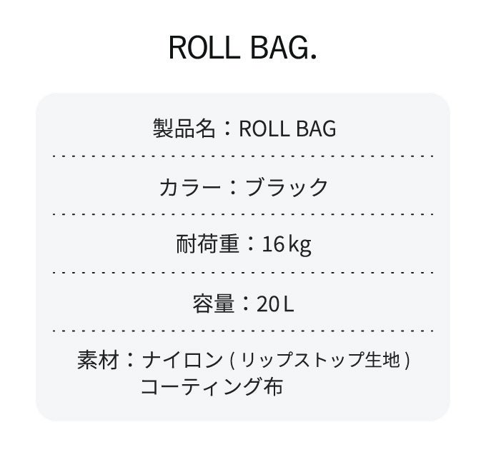 ROLL BAG は、スタイリッシュな見た目なのに段ボールがすっぽり入るほど物が沢山入ります。荷物が多くなるお買い物の日や、ご旅行やキャンプなどのアウトドアにもおすすめです。