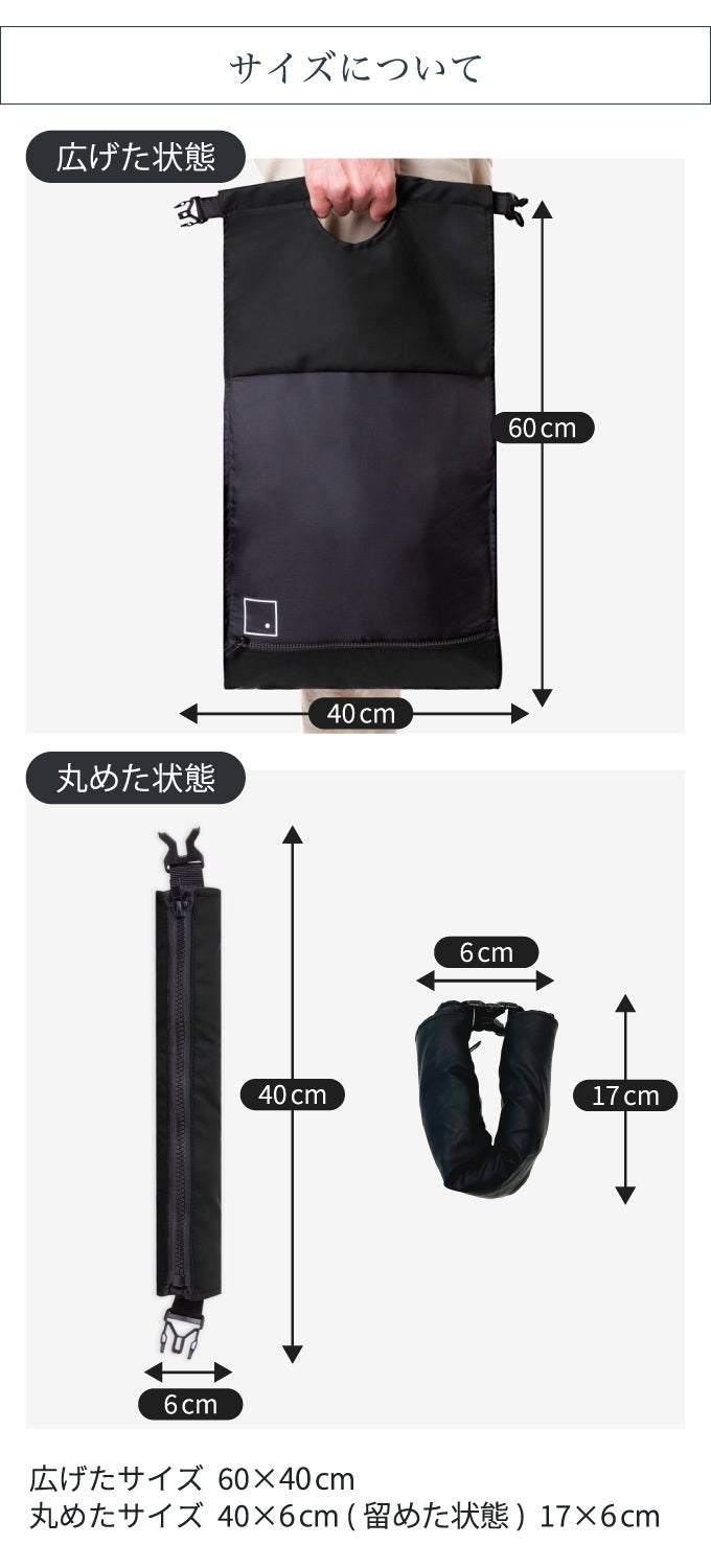 コンパクトに変形できるだけでなく、収納性・軽さ・丈夫さ・撥水性 の機能が備わり、外出時に大きいカバンをミニマルに持ち歩きたい方にオススメな新しい製品です。