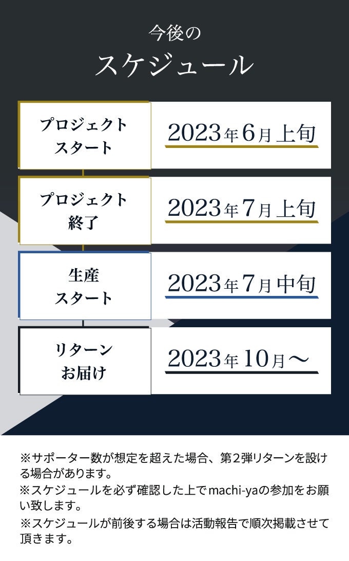※本文中に記載させていただいたスケジュールは、あくまでプロジェクト公開時点の予定です。ご支援の性質上、配送遅延のおそれがございます。