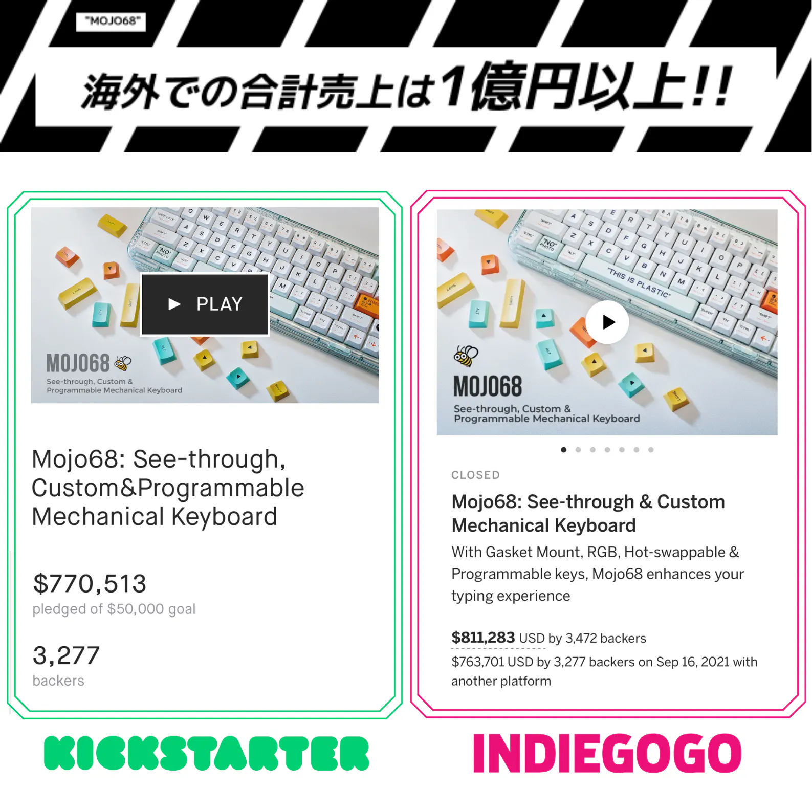 今回皆様に紹介する「Mojo 68」は、私たちが取り組んだ初めてのプロジェクトとしてKickstarterやIndiegogoにて手厚い声援を受け、総計1,534,184米ドルの調達に成功いたしました。
