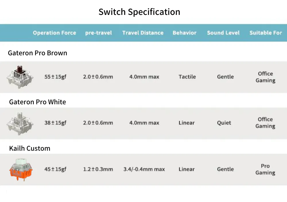 標準で搭載されるキースイッチは、Gateron Proの白軸、茶軸とKailh Customからお選びいただけます。
