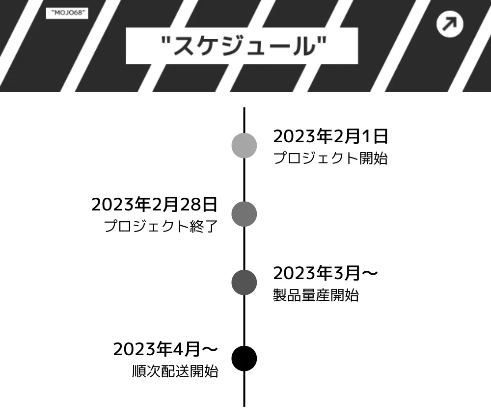 ※本文中に記載させていただいたスケジュールは、あくまでプロジェクト公開時点の予定です。クラウドファンディングの性質上、配送遅延のおそれがございます。原則として、配送遅延に伴う支援のキャンセルはできませんが、リターン配送予定月から6ヵ月を超えた場合には、希望者に限りキャンセルにて対応させていただきます。