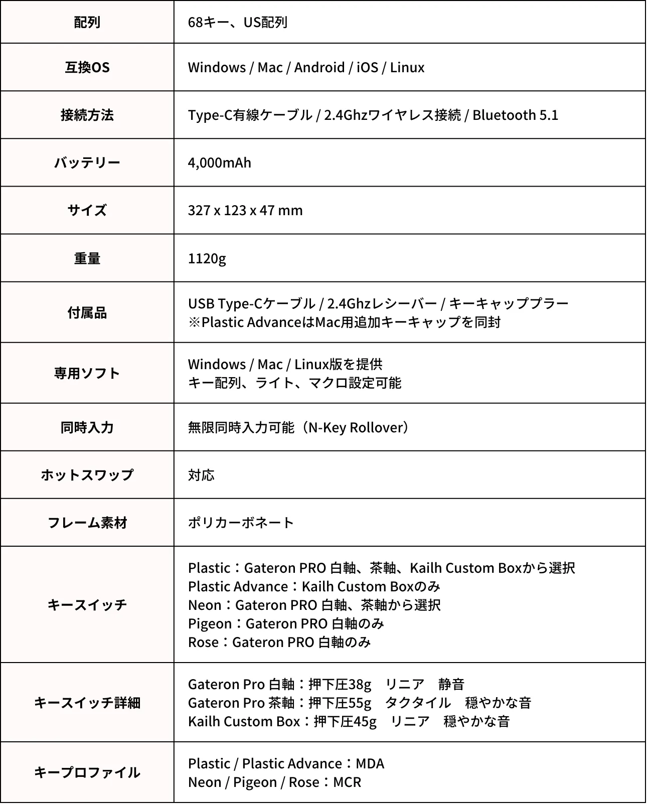 ※モデルによって選択可能なキースイッチが異なります。詳細はリターンに記載している内容をご参照ください。