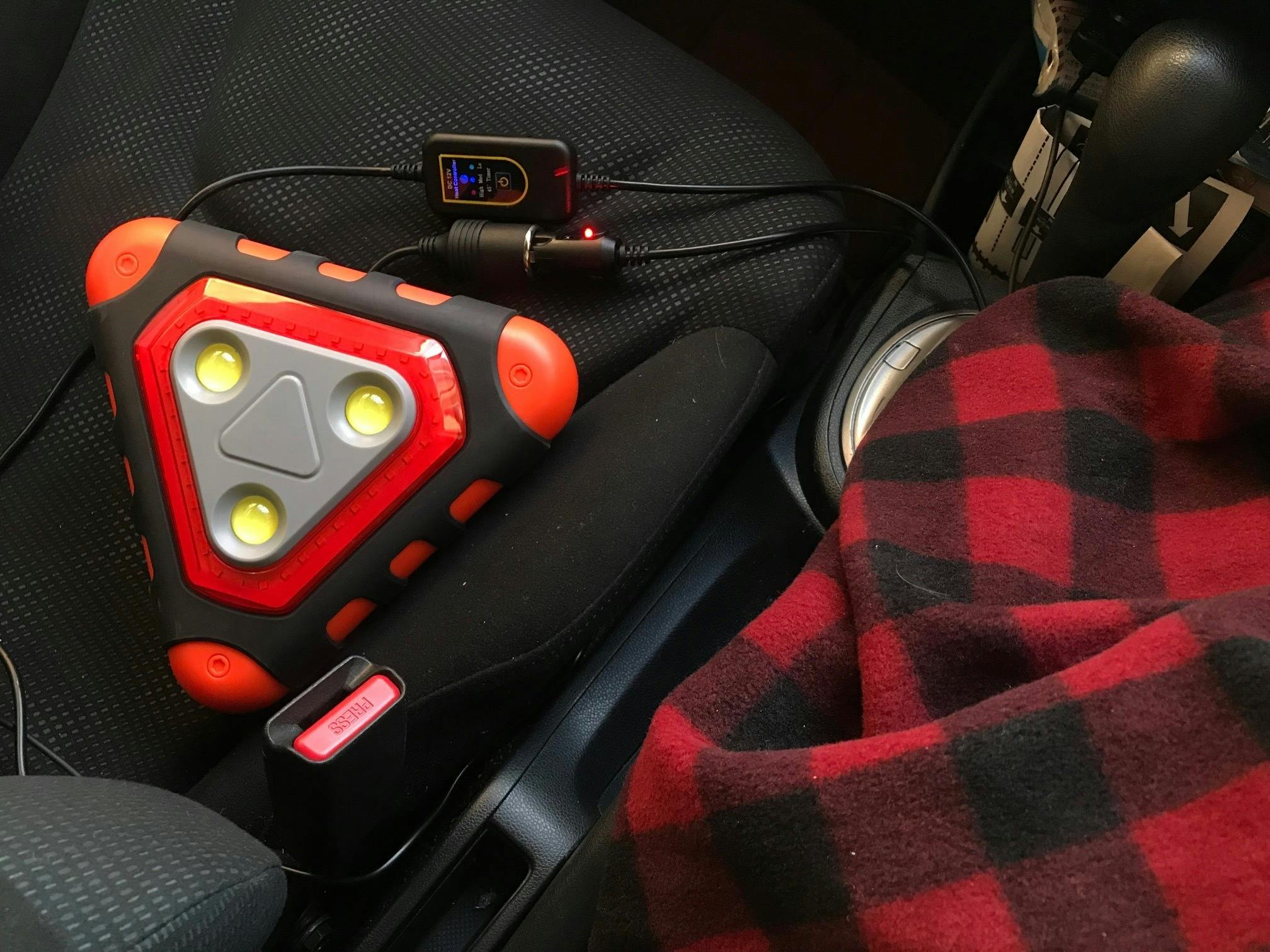 ↓ 例としてDC12V駆動の電気毛布を接続、駆動させた写真です。約40分間実際に使用する事ができました。冬季の車内での短時間仮眠にお使い頂けます。