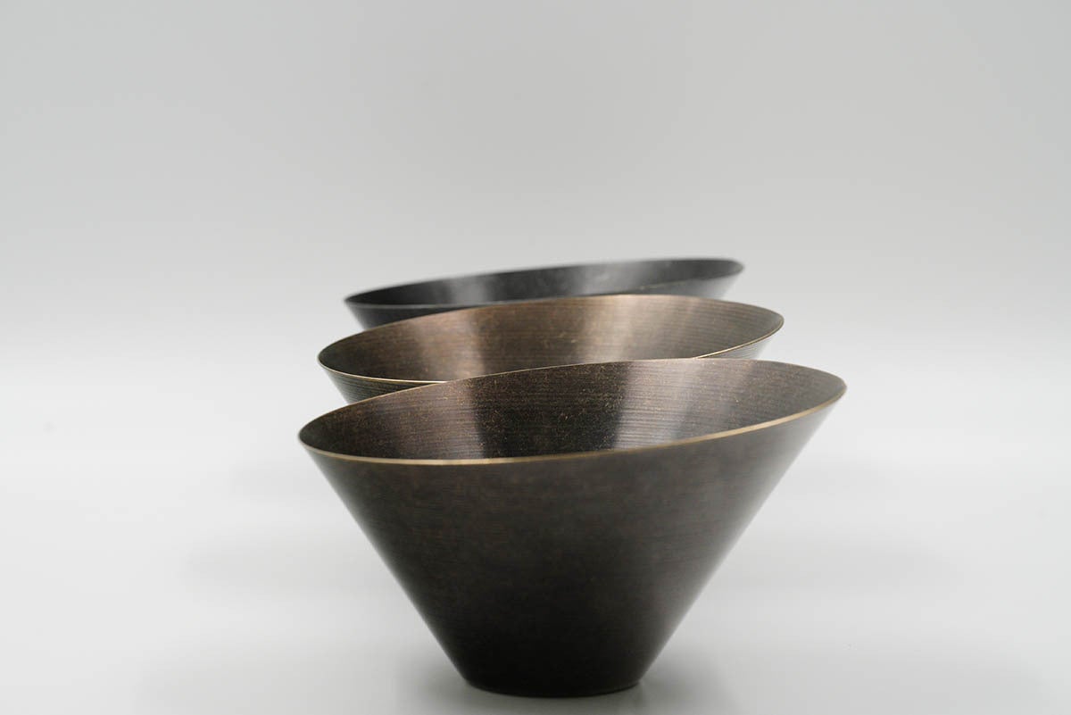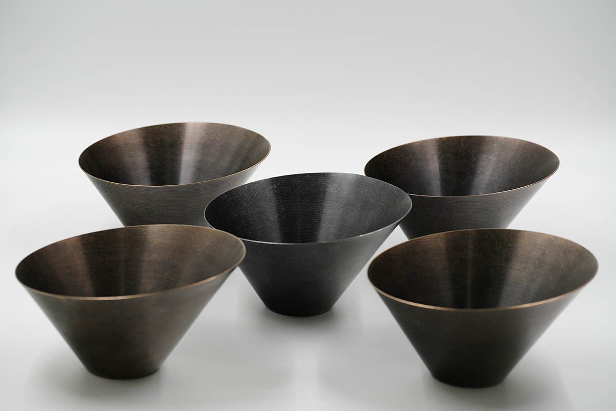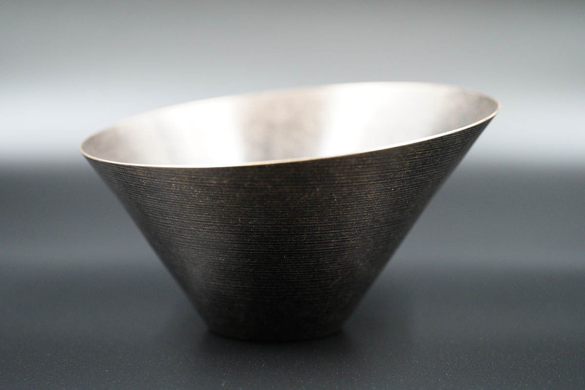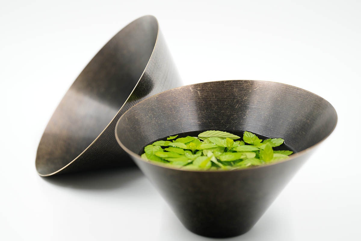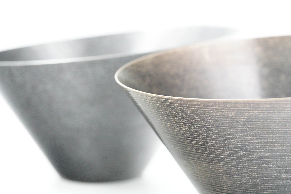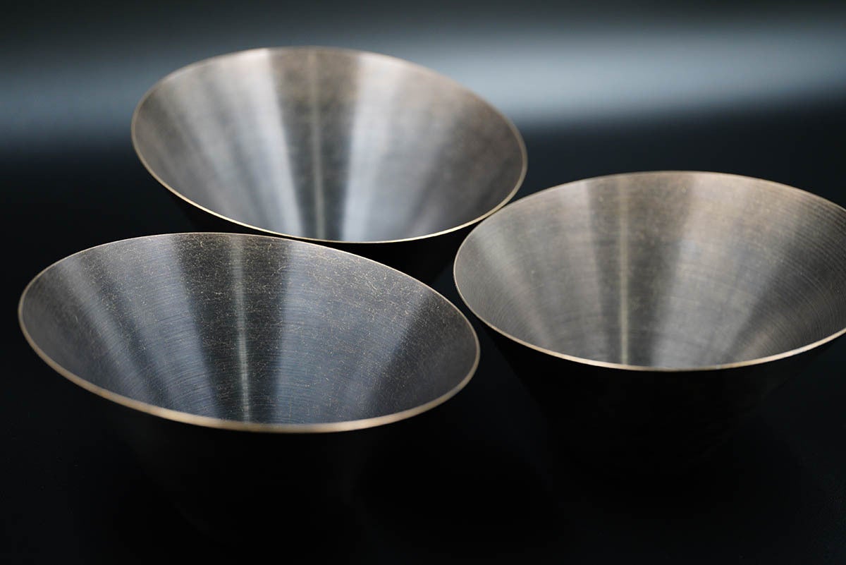 商品として特徴を持たせるために、レーザーカッターを使ってアシンメトリー(左右非対称)に器をカットしてあります。波状の加工痕を最大限に活かすため、表面を加工するメッキの一種である「金古見(きんふるみ)」を採用しました。