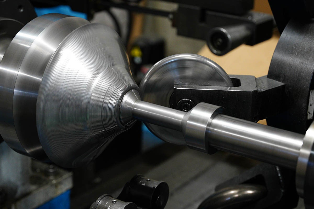 深絞り加工の中に「へら絞り」という加工方法があります。へら絞りとは遥か昔、中世ヨーロッパから続く伝統的な金属加工技術です。金属の板を高速で回転させ、そこへ同じく金属でできたへらを当てがい、まるでろくろのような要領で形を作っていく加工法です。
