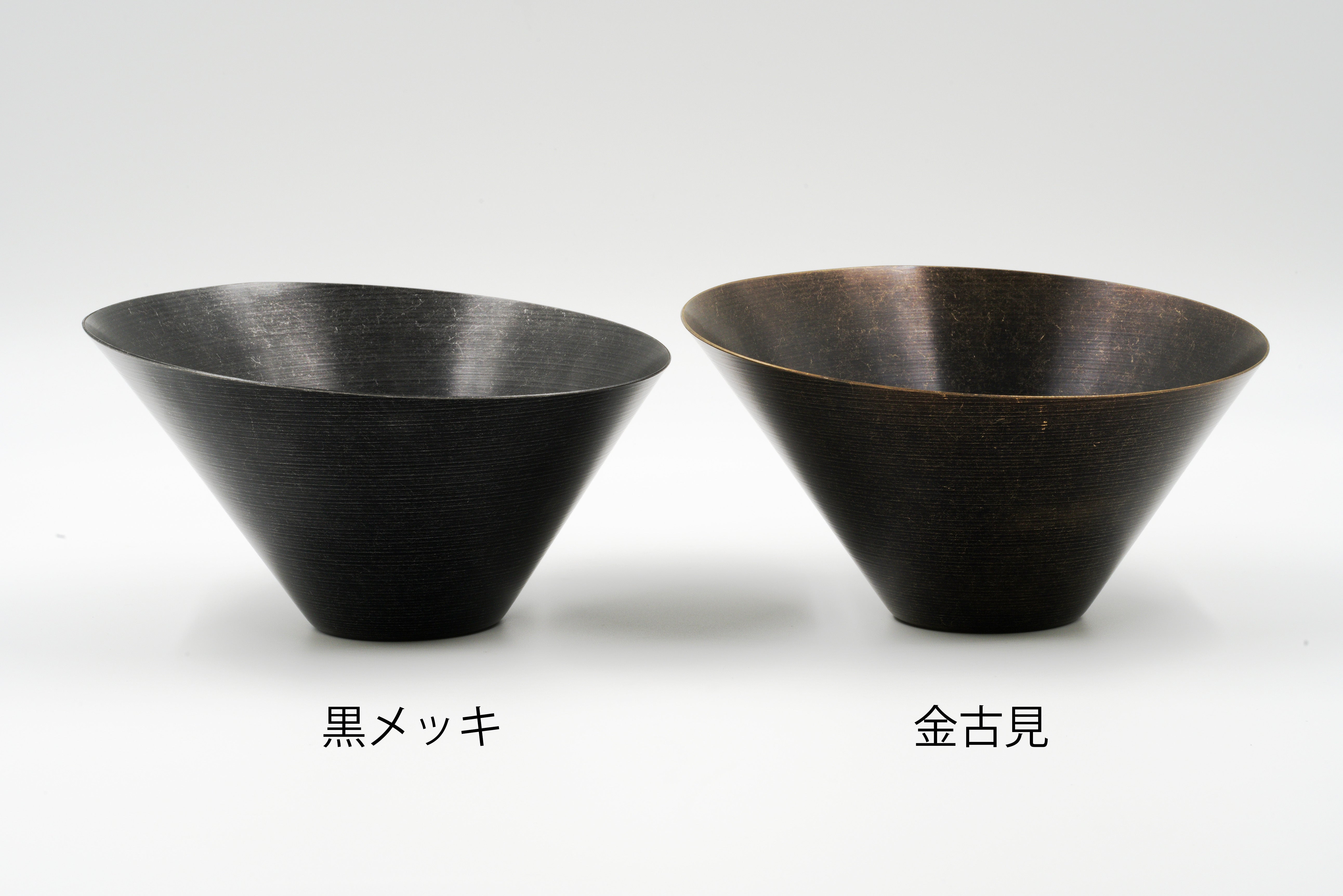 金古見(きんふるみ)は、まず初めに表面を黒く発色させ、その後あえて研磨をかけて傷をつけます。最後に研磨の傷跡の部分に金メッキを乗せることで傷跡が金色に輝き独特な質感を演出します。この技術も地元の燕三条の企業さんにお願いしました。