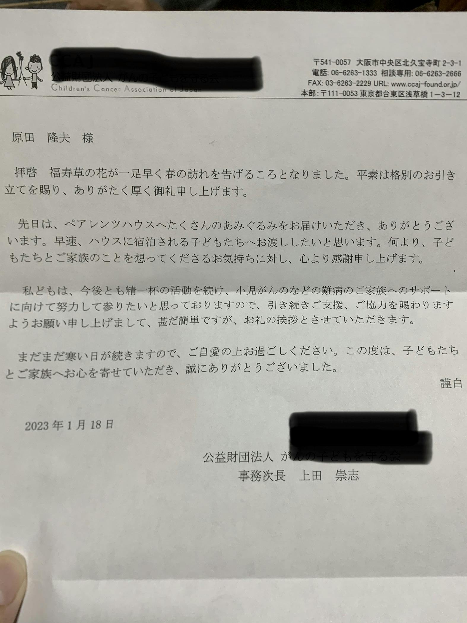 鈴木智裕兄様 大関恵姉様 西田琴乃姉様 岡本永司兄様 からのご支援で編みぐるみを贈ったことへの感謝状が届きました。