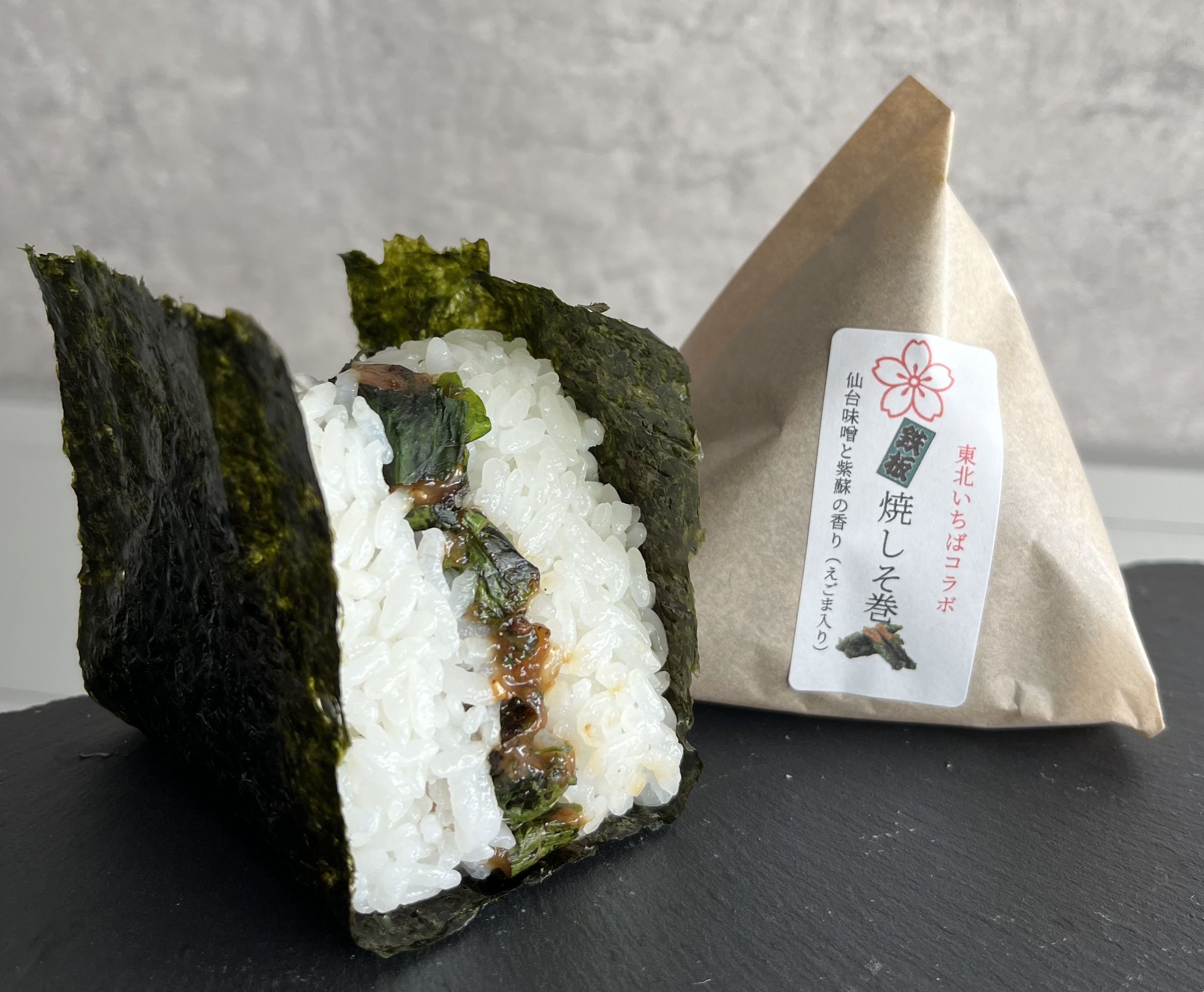 このクラウドファンディングを勧めて下さった「東北いちば」様ともこのモシダテでご一緒したご縁で、当店では東北いちばさんの美味しい「鉄板焼しそ巻」のおむすびもコラボ商品として販売しており、一般的な揚げたしそ巻きと違い「鉄板で焼き上げた手作りのしそ巻き」に「えごま」 が加わりさらに健康や美容にも特化した古くからあるしそ巻きが新しいおむすびメニューに加わりました。