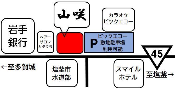 仙台方面から45号線を多賀城方向にまっすぐです。仙台駅から45分前後。