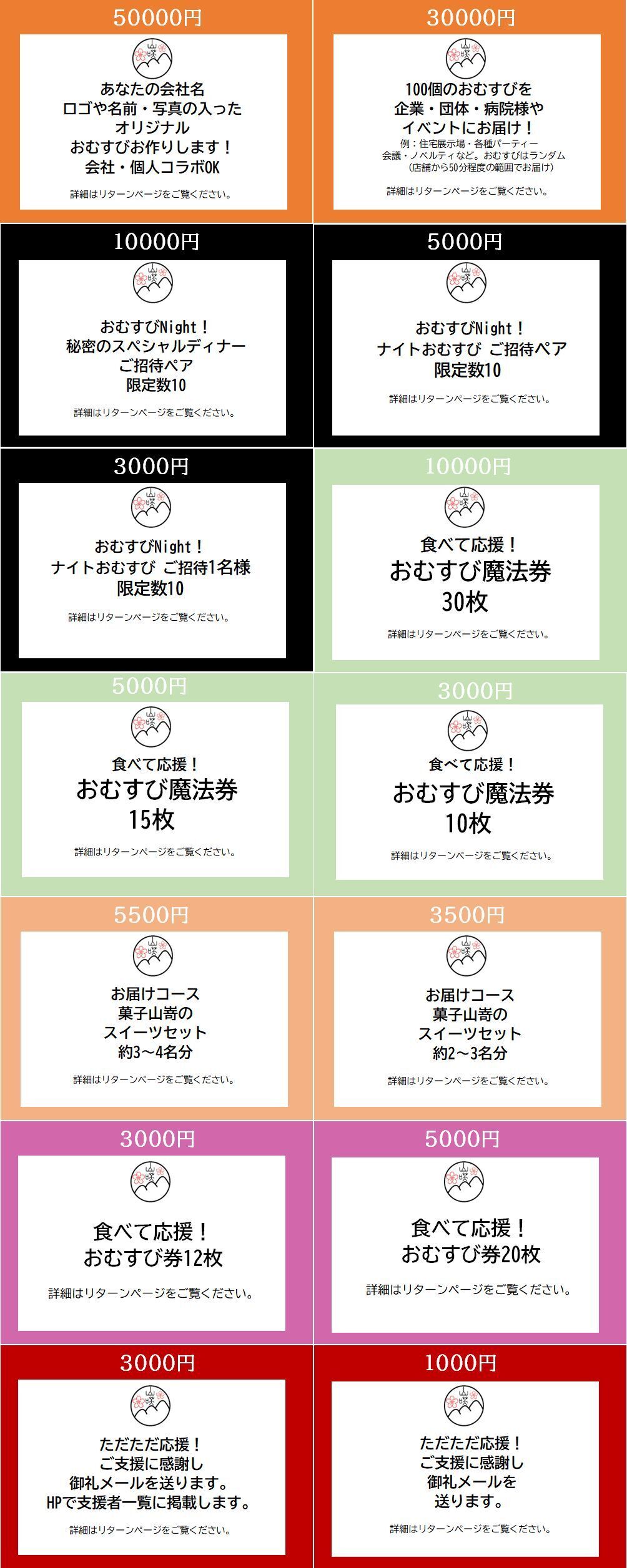 ※本当は山咲のおむすびを作る体験や見学などを盛り込みたいところでしたが、山咲のおむすび作りは通常のおむすび作りとは違った製造方法の為、企業秘密で非公開なのです。どうかご理解下さいませ。リターンのお渡し時期はあくまで目安です。対応可能な順に御連絡差し上げます。一人で対応します為、ご支援多数の場合は順次ご連絡差し上げますのでご理解の程お願い申し上げます。詳細はリターンページをご確認下さい。