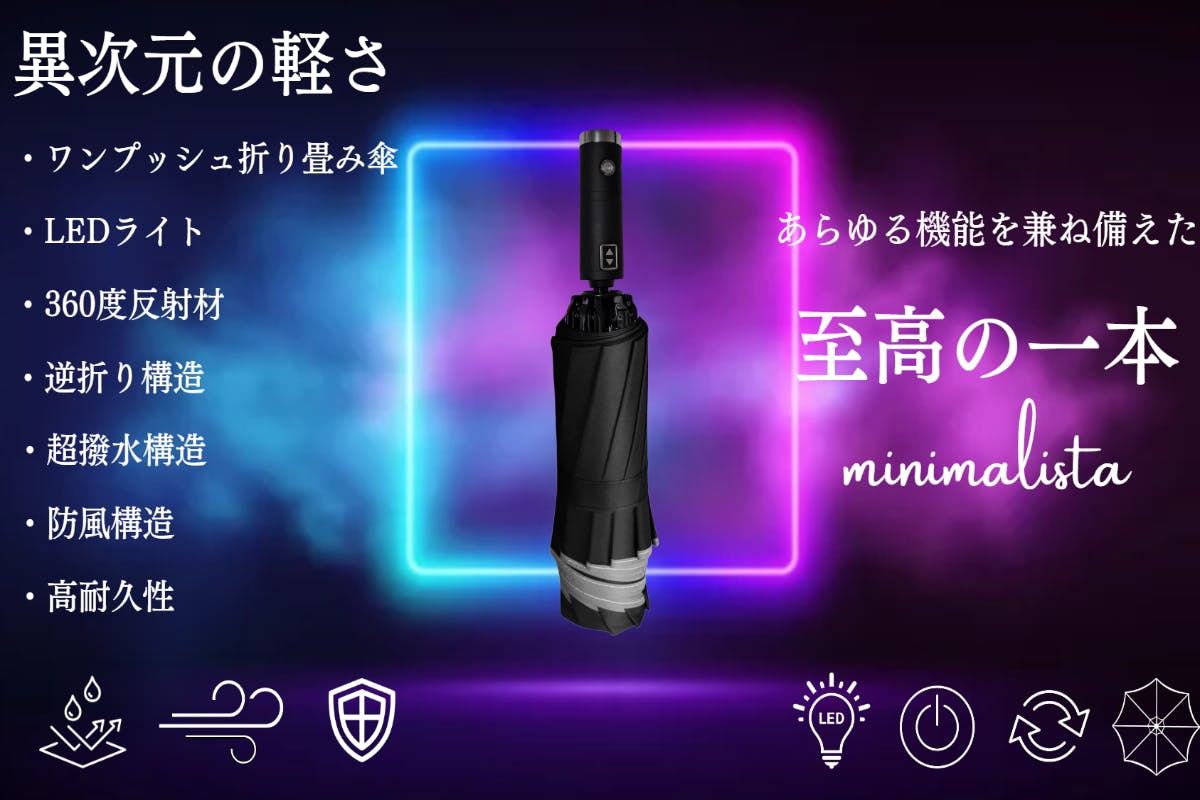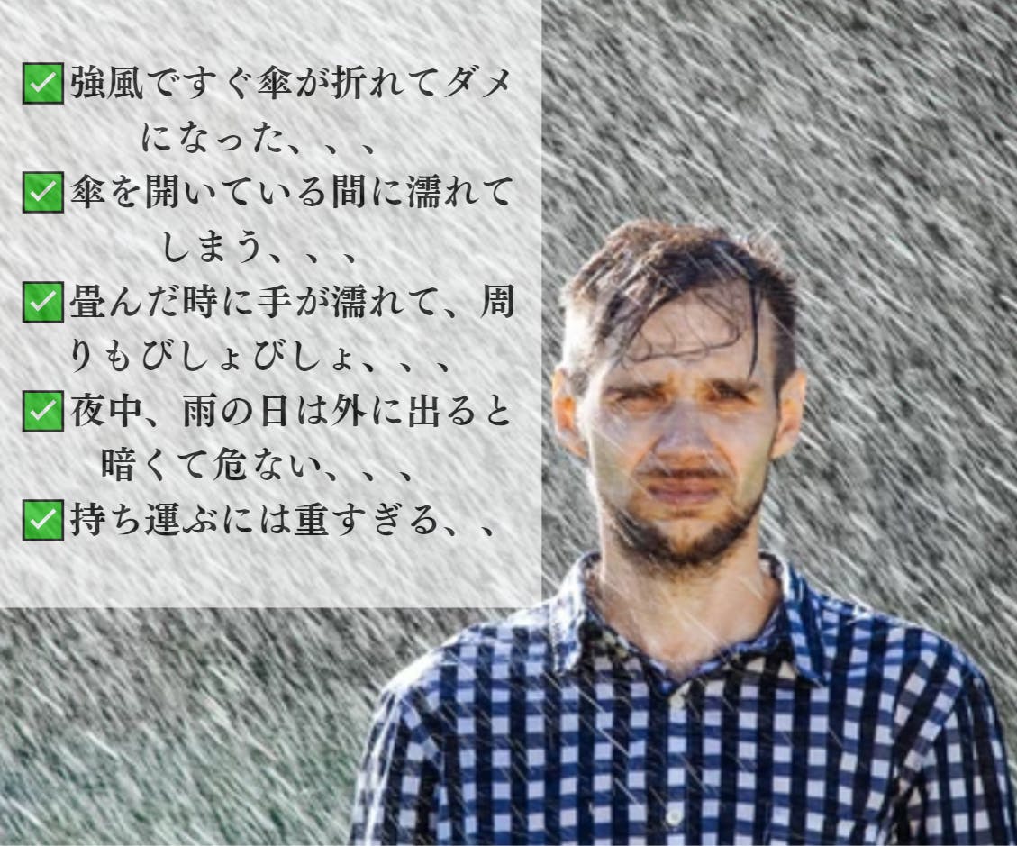 「傘を開いている間に服が濡れてしまったり、わざわざ重い荷物を1度置いたり、手元の大事な書類が濡れてしまったり・・・」そんな悩みから『minimalista』はあなたを解放します!