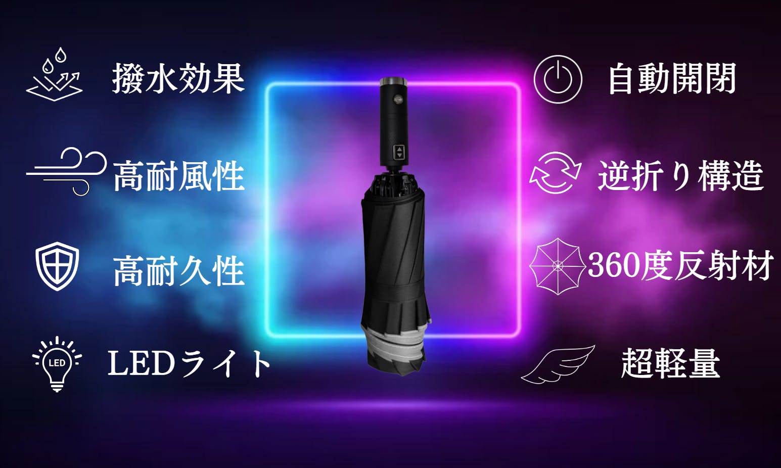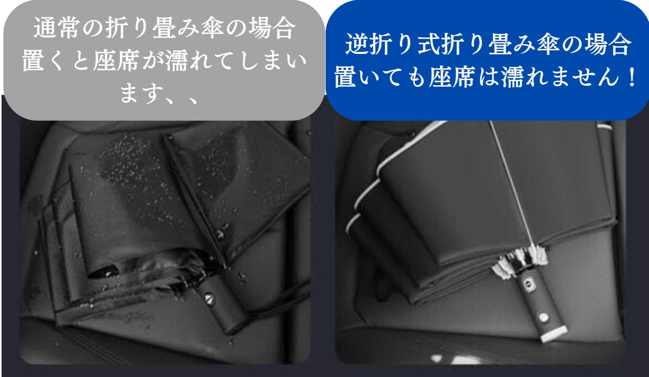 逆折り式と自動開閉ボタンにより、スムーズな車の乗り降りを可能にし、車内を濡らすことも、