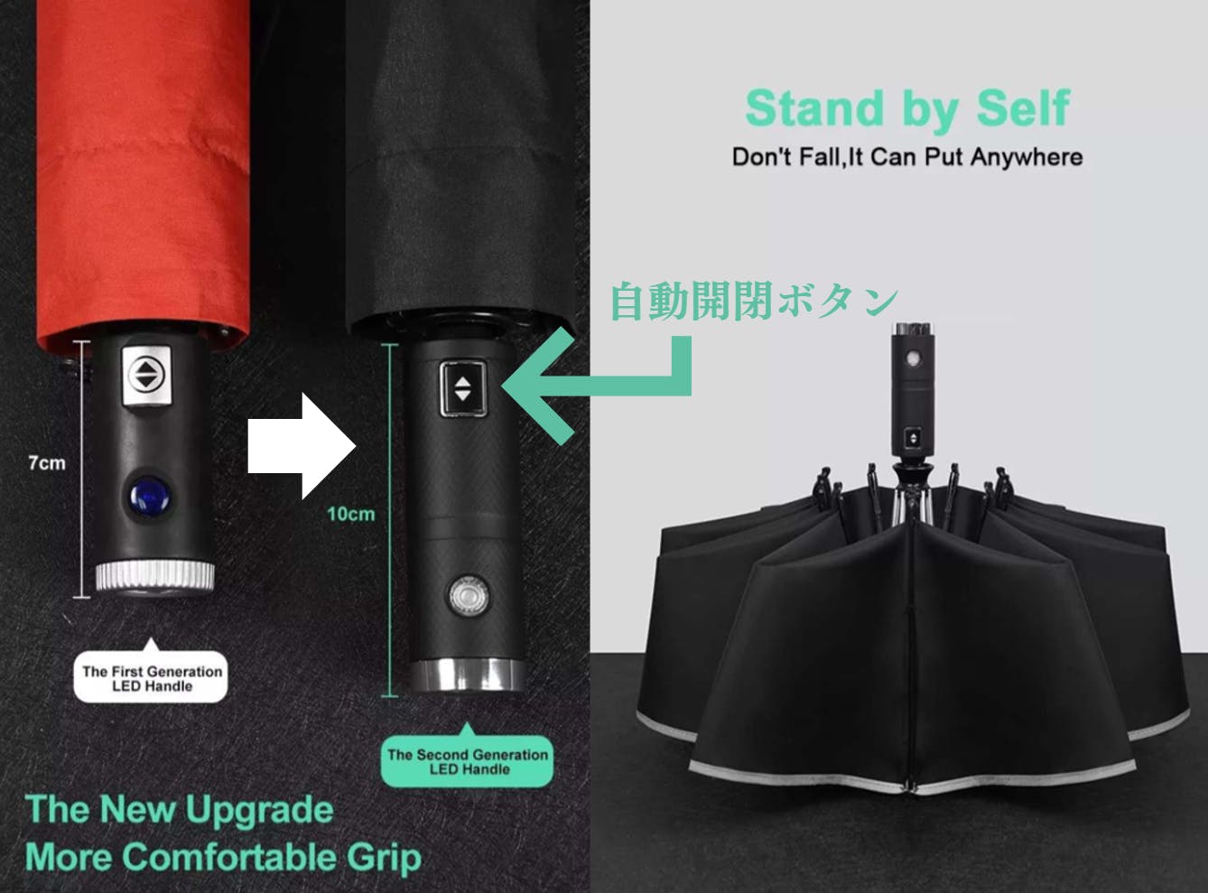 持ち手の部分が長くなったことで、より持ちやすくなり、自立型の持ち手によって、傘置き場がない場所でもどこでも傘をたてることが可能です。