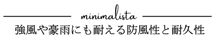 『minimalista』は強さと軽さのバランスがとれた8本タイプで、軽量かつ丈夫なグラスファイバー製の親骨を採用し、耐久性に優れた防風構造になっています。