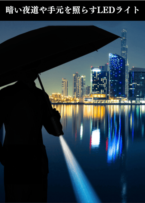 さらに、持ち手部分には高性能LEDライトを搭載。暗い夜道も足元を明るく安全に照らしてくれます。