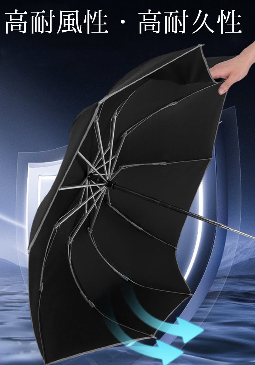 軽量で高い耐久性と柔軟性を持つグラスファイバー製の親骨は、強風や豪雨にさらされても、しなることで折れにくい防風構造になっています。