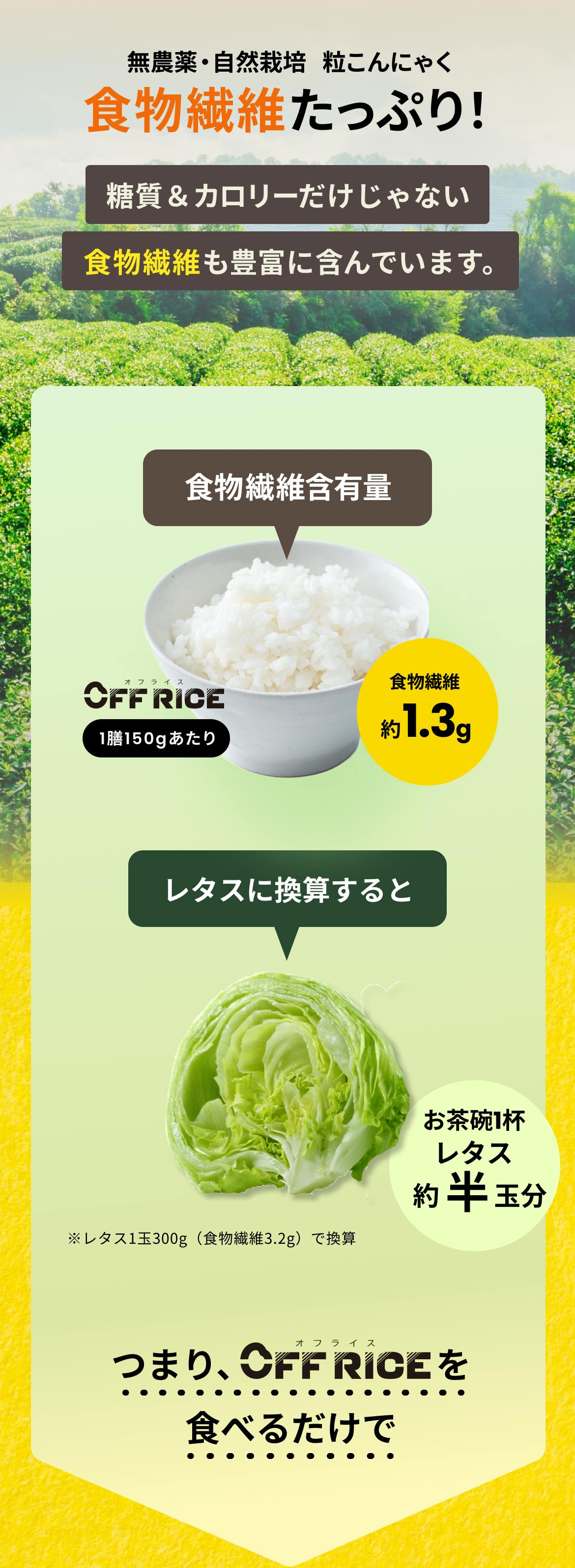 今回はその取り組みの一環として、「糖質オフでカロリーオフなのに、本当においしい無洗米 OFF RICE」の開発を、福岡の米農家さん、米問屋さん、自然栽培むかごこんにゃく米の加工業者さんのご協力を頂きながら進めています。