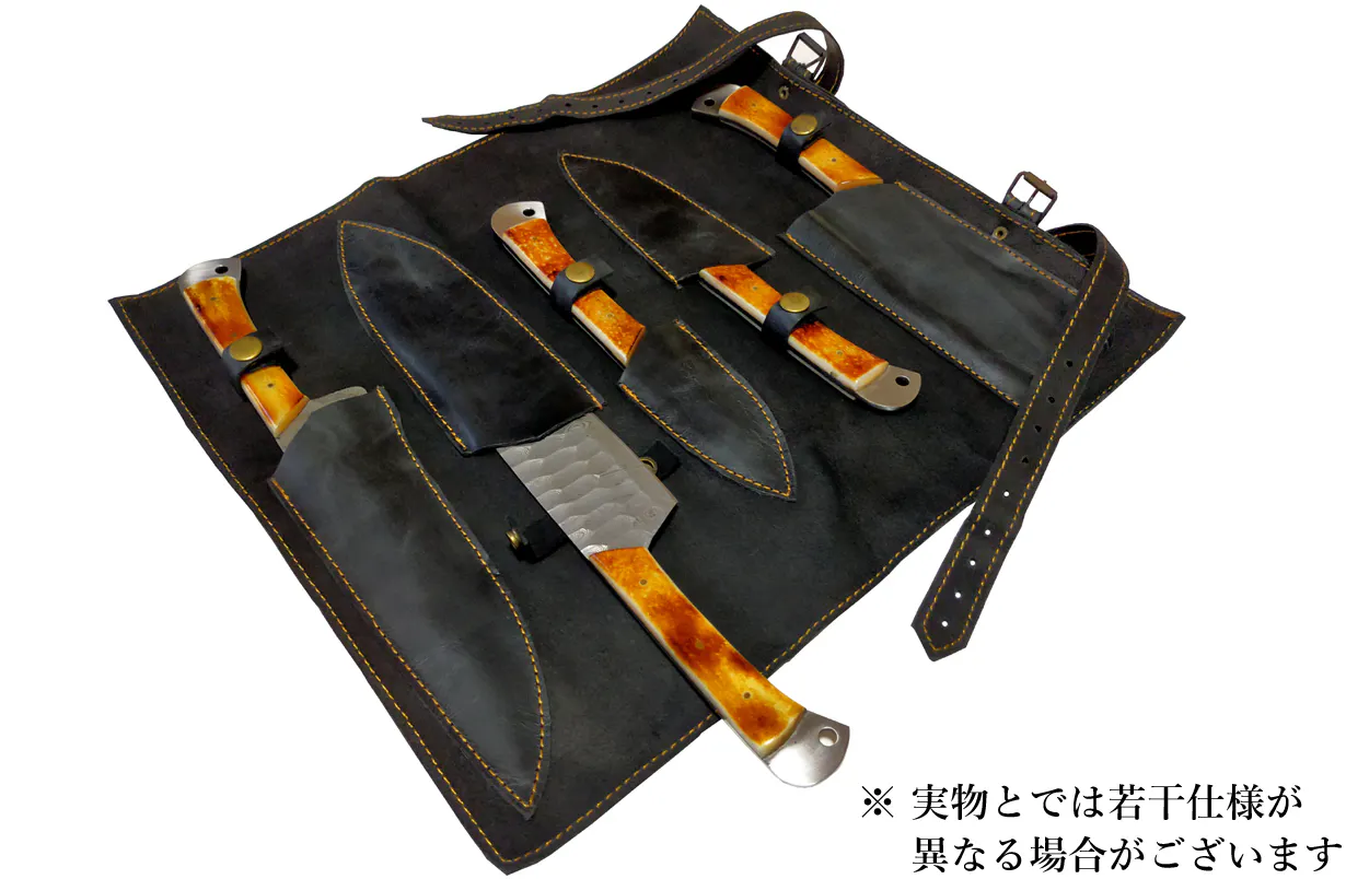 美しく切れ味の良いダマスカス鋼の包丁5本をすべて収納して持ち運べる特製の専用カバーです。ハンドメイドの包丁に合わせて制作した特製の専用カバーは、レザーに太い糸で縫製したステッチが男心を刺激する逸品。もちろん包丁と同様にカバーもハンドメイド。その重厚な作り込みは、あなたの所有感と優越感を存分に満たしてくれることでしょう。