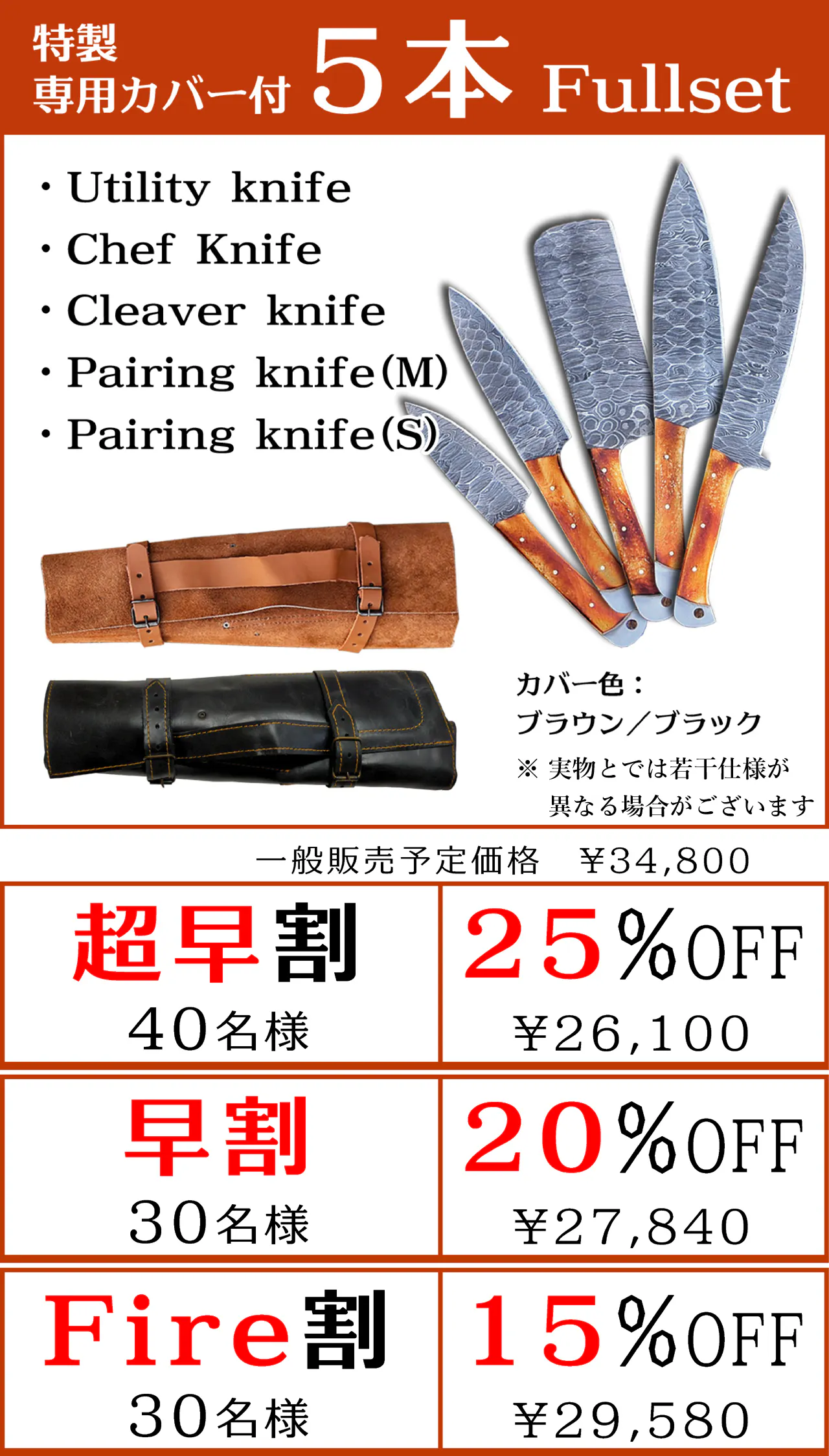 ◎ 特製専用カバーとダマスカス鋼包丁5本のセットを特別価格でご提供いたします。