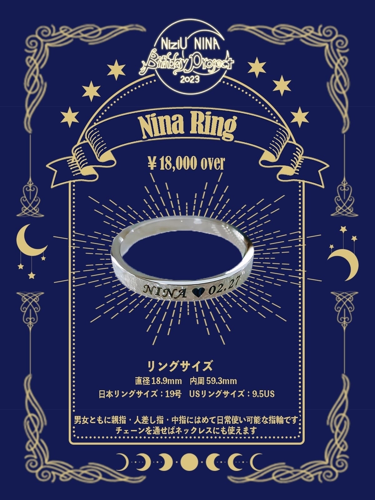 ・18000円:広告原画配布+カップホルダー (データ配布)+ニナペン会員証(カード)(1枚)+ホログラムカード(1枚)+キーホルダー(1個)+広告に名前を掲載+指輪(1個)