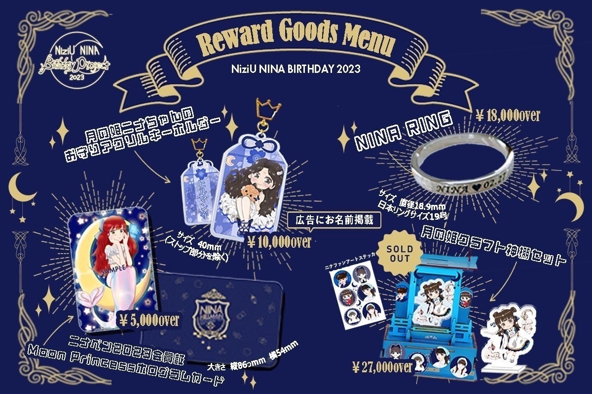 ・27000円:広告原画配布+カップホルダー (データ配布) +ニナペン会員証(カード)(1枚)+ホログラムカード(1枚)+キーホルダー(1個)+広告に名前を掲載+指輪(1個)+アクリルスタンド(1個)+クラフトセット(神棚+デコレーションステッカー)※限定10名
