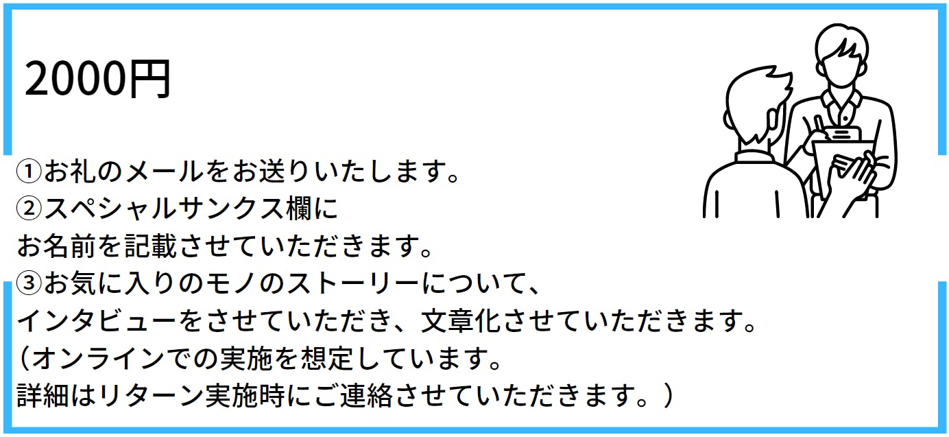 ご支援いただいた方々へのリターンは下記のものをご用意しております。