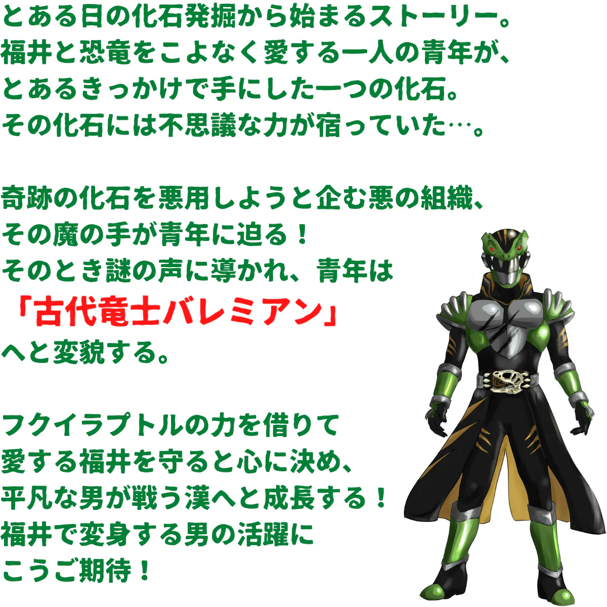 「古代竜士バレミアン」は、ご当地ヒーローならではの低コストで福井県の各地に見参します!