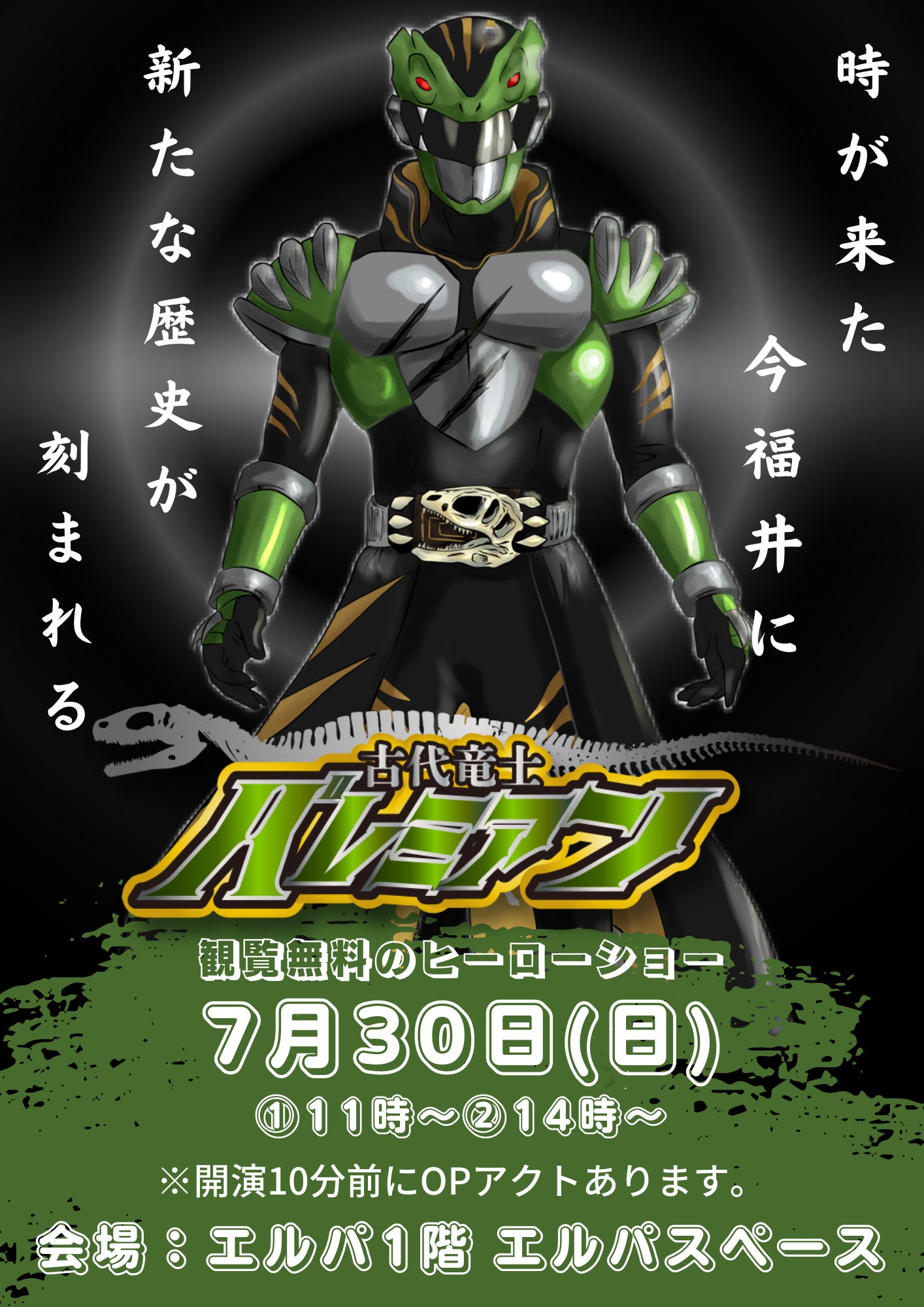 【情報解禁】『古代竜士バレミアンショー』日にち 7月30日(日)時間 1回目11:00〜  2回目14:00〜会場 エルパ1階エルパスペース福井特撮プロジェクト代表のマサ越前が手掛ける、フクイラプトルをモチーフにした福井の新しいご当地ヒーロー!この日が初お披露目の予定です!月1体験交流イベントユアエルパの7月のイベントとして行います!観覧無料です!ショー終わりに握手会、撮影会、グッズ販売を予定しています!ショー10分前には、とある団体さんによる素敵なオープニングアクトもご用意しています!1月からクラファンを行い、ヒーロースーツと主題歌を費用を無事に集めることが出来ました!約半年間かけてプロジェクトのメンバーで準備を進めてきました!お子さんはもちろん、ストーリーは大人の方にこそ観てほしいと言っても過言じゃない内容に仕立てました!福井には何もないと言ってしまう自虐的風潮、福井の人はリアクションが冷めているというネガティブな県民性。それをポジティブに変える生のエンタメを目指しています!この日は最低でも100人のお客様を集めるという目標でいます!必ず楽しいステージにするので是非遊びに来てください!後悔はさせません!福井に新たなエンタメが誕生する一日、お見逃しなく!!