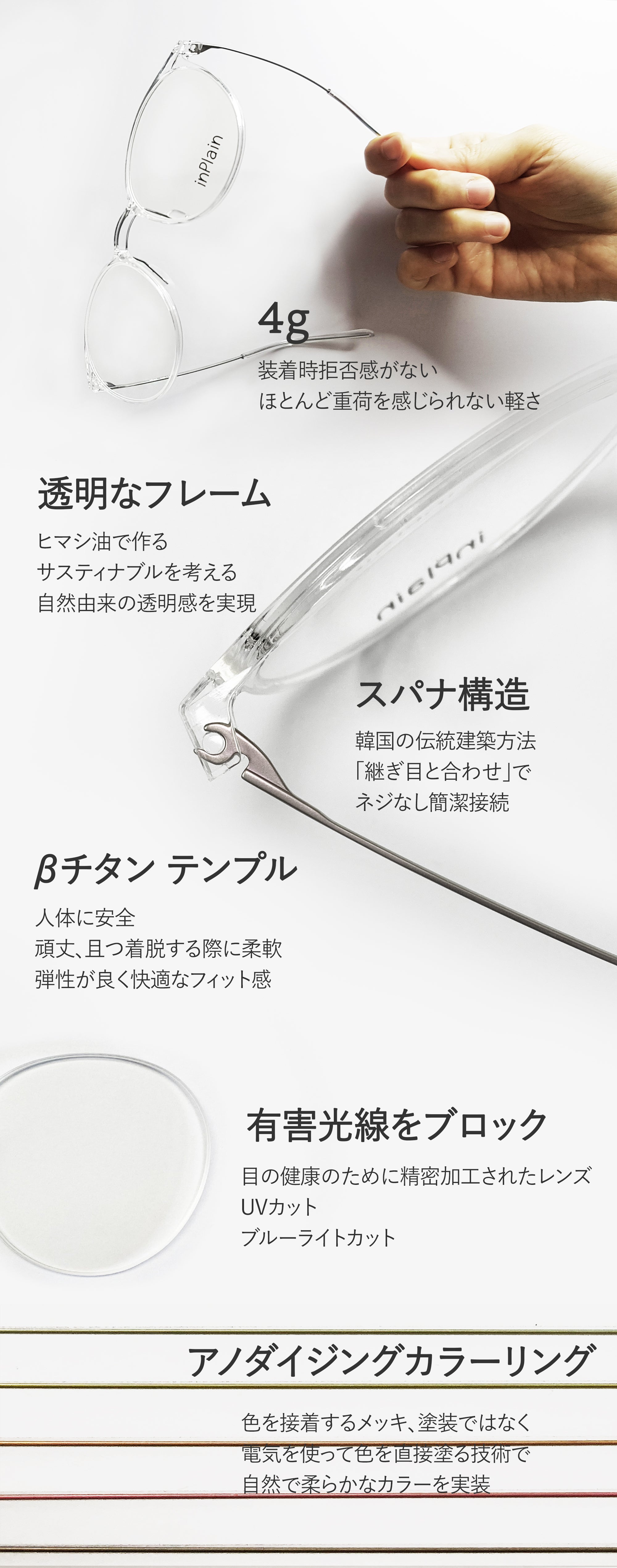 インプレーンは、フレーム、ブリッジ、テンプル(メガネ脚)でつながる構造に、いかなるネジも無く、1本のラインで接続されています。韓国の伝統建築"韓屋(ハノク)"に適⽤される技術に 「継ぎ⽬とカスタマイズ」があります。釘やネジなしで⾃然に接続し、造形的になめらかで簡潔ながらも頑丈で⻑持ちする構造です。