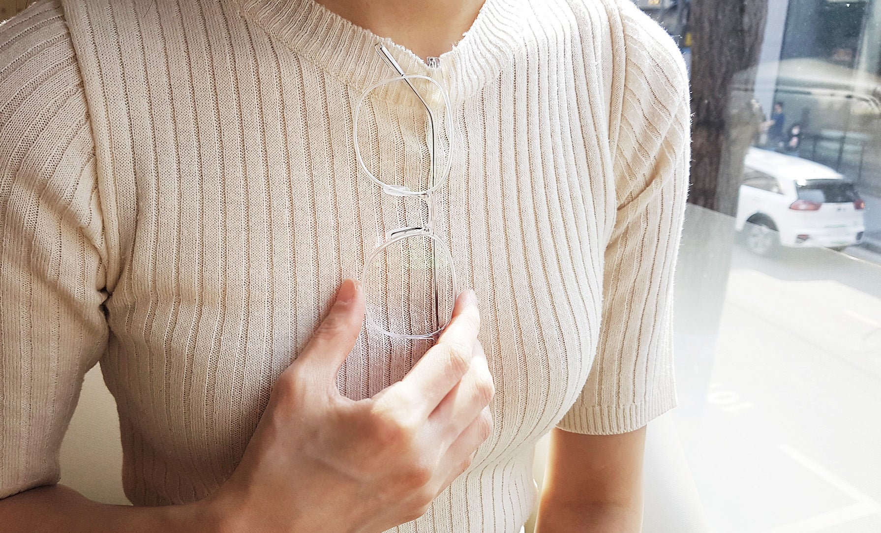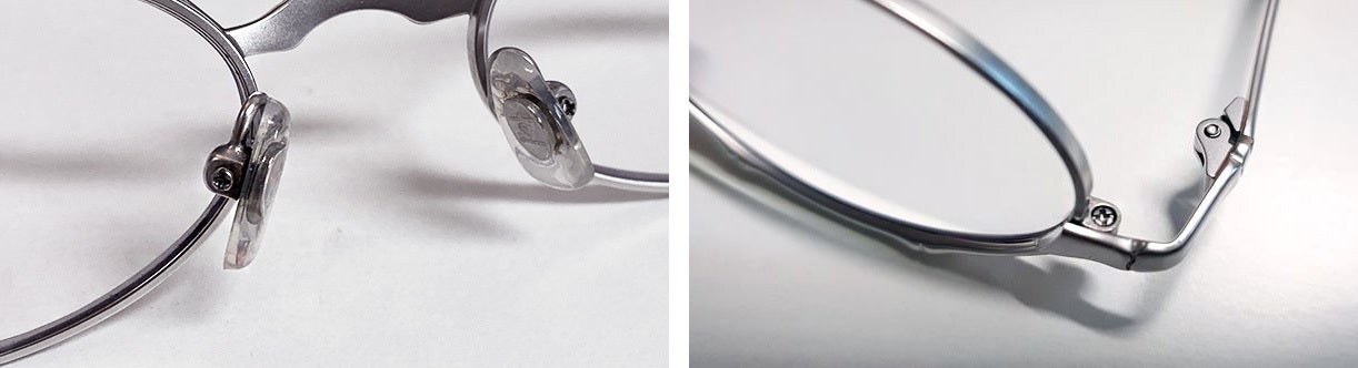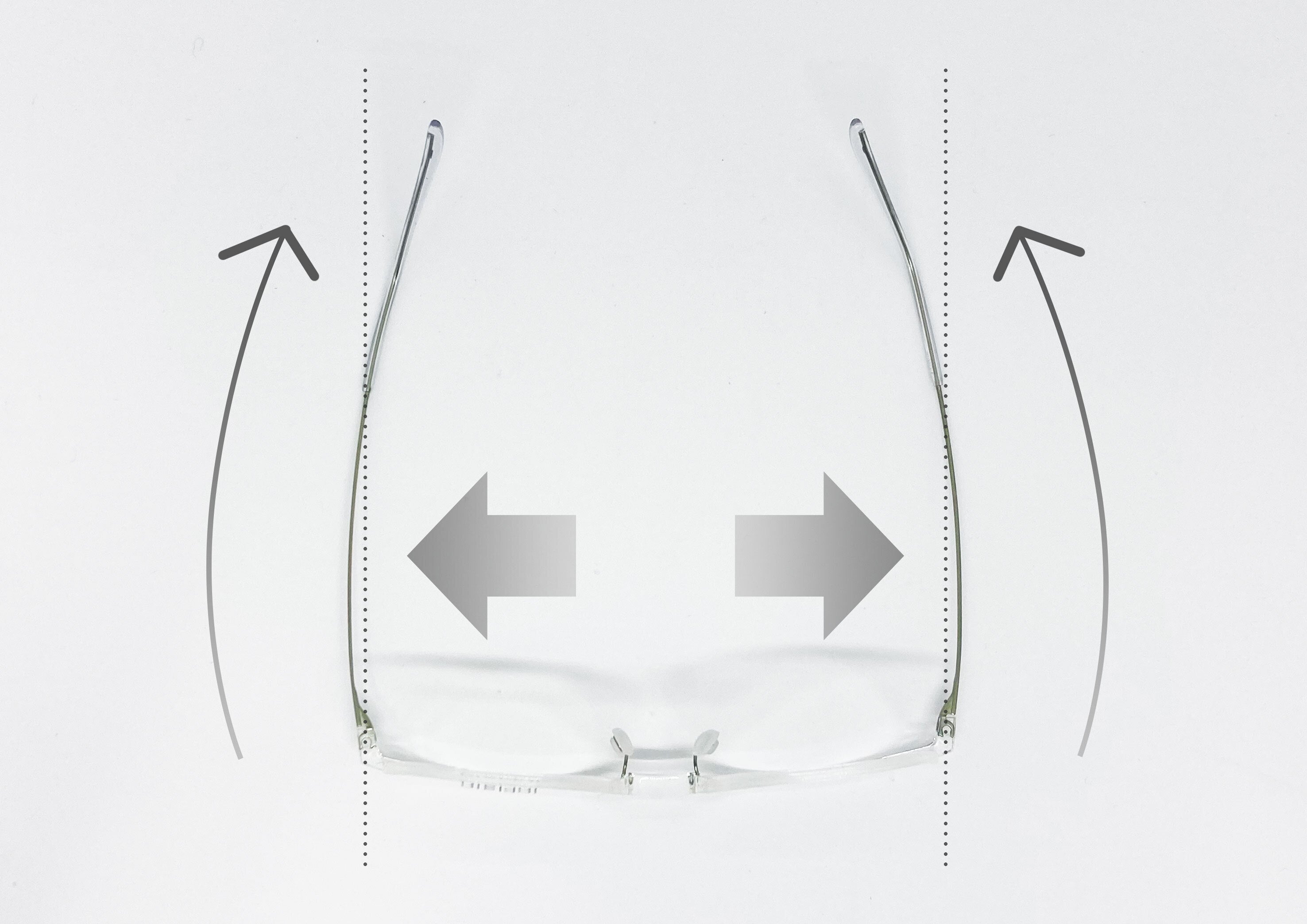 また腐食性がなく人体に優しい素材を使用していますが、肌の敏感さの程度は着用者によって異なるため、メガネの脚が肌に触れにくい角度に調整されています。