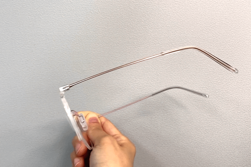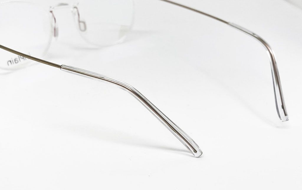 メガネ脚の部分には通常テンプルが⾒えない暗い⾊を使⽤しますが、インプレーンは脚の端まで綺麗にアノダイジングカラーを実装し、眼鏡の⾜の⾊味をさらに引き⽴てるように透明チップを適⽤しました。