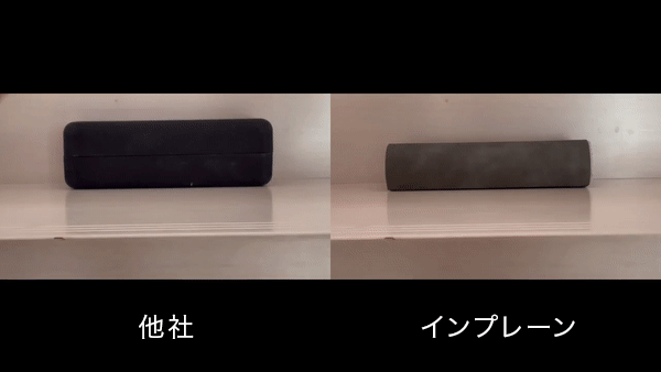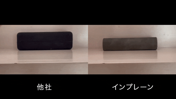 ヒンジレス眼鏡は一般的になってきていますが、収納する際、または折り畳んだ状態を比較してみると、インプレーンのその構造特性上、かなりコンパクトでかさばらないことが分かります。
