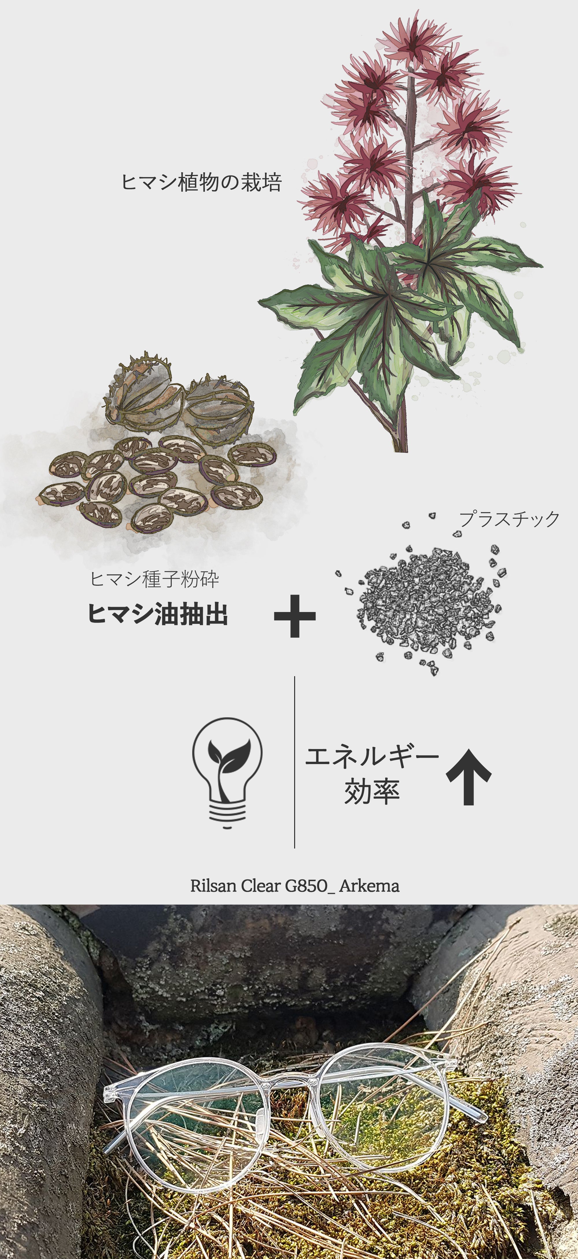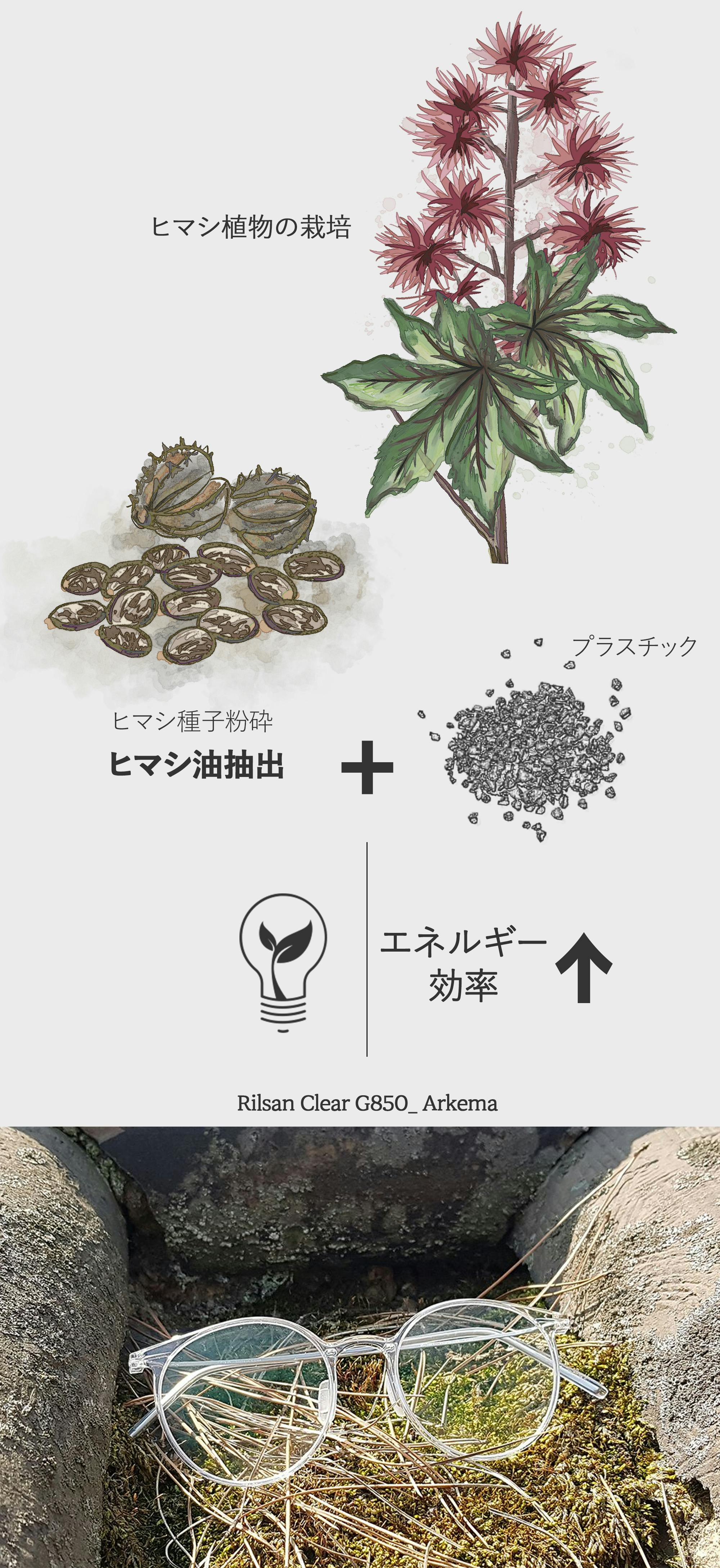 ヒマシを栽培した後、種⼦を粉砕して抽出したヒマシ油と化学基盤のプラスチックが混合されて作られた素材で、45%以上のバイオマスから生成されています (45%はメガネフレームに使⽤されるための耐久性を確保するための割合で適⽤されました)