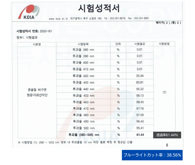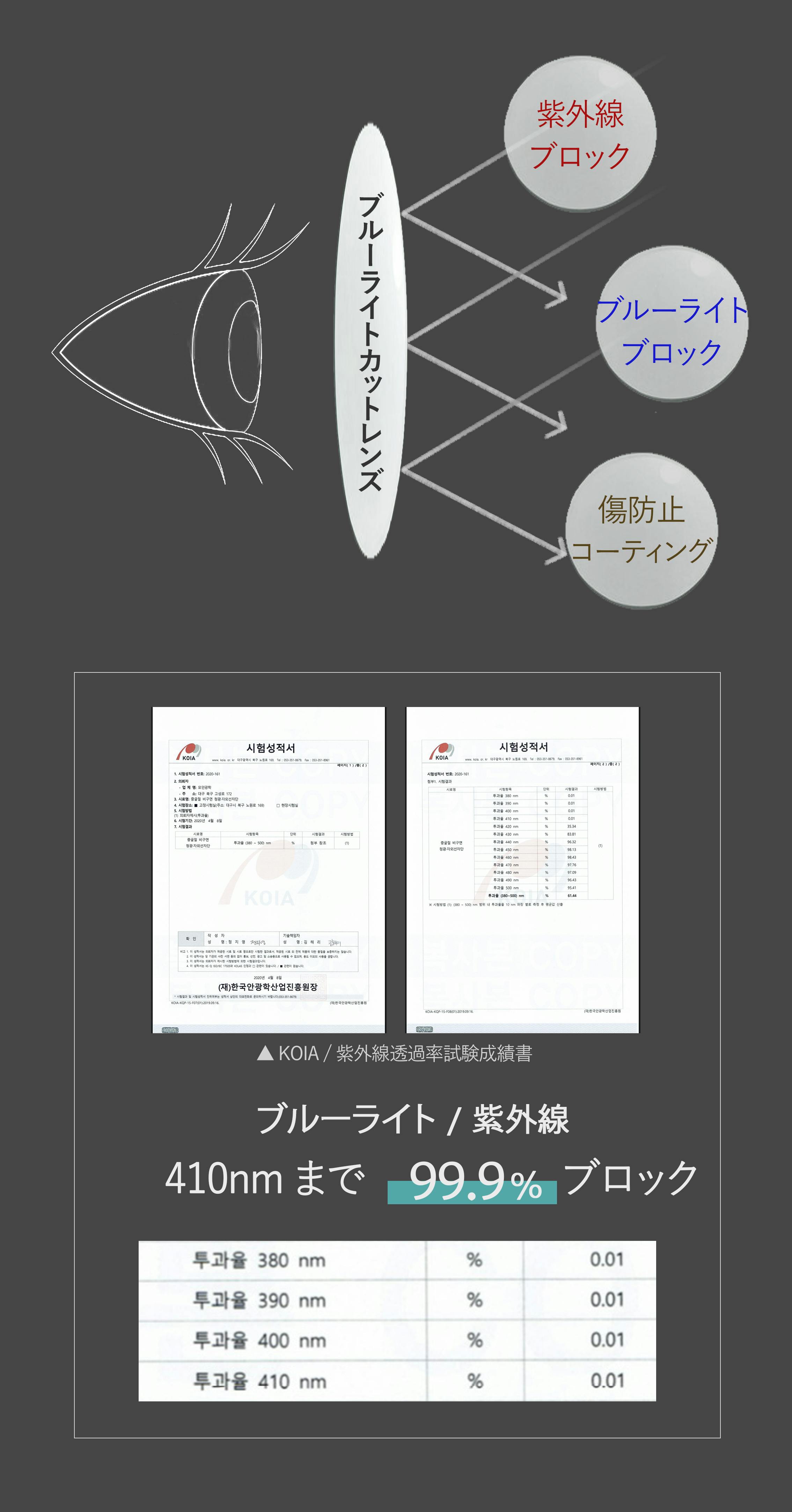 InPlainレンズは目や肌に影響を与える紫外線を99%カット。かつブルーライトは最も波長が強く目に有害なHEV領域にかかる380-410㎜で99%、410-420mm区画では64%という試験結果が出ています。