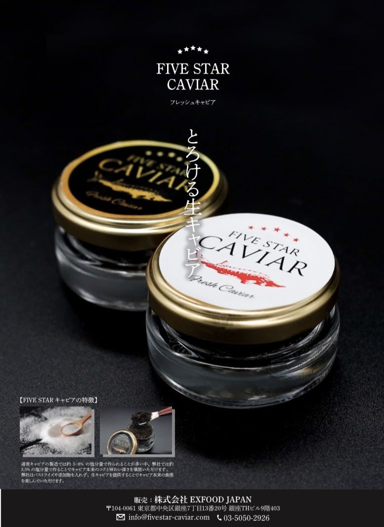 弊社のファイブスターキャビア(生キャビア)を使った(お一人当たりたっぷり15g相当!)特別コースを10%割引にてご提供いたします。