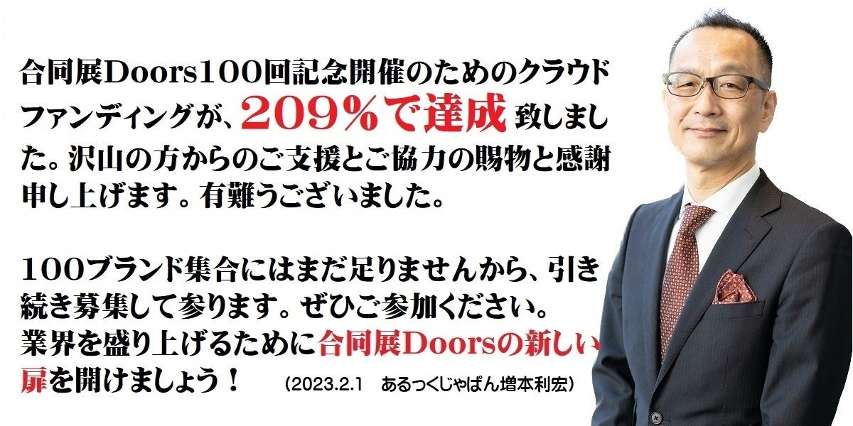 達成致しました。沢山のご支援に感謝申し上げます。今回のプロジェクトに沢山のご支援と応援を賜り誠に有難うございました。まだまだ100ブランドには足りませんが、引き続き宜しくお願い申し上げます。弊社は微力ですが皆様のご支援と応援を力に、アパレル業界(特にミセス系マーケット)の活性化に貢献出来るようこの支援金を使わせて頂きます。また、合同展Doors100回で終わることなく継続して参りますので、どうぞこれからもご支援の程宜しくお願い申し上げます。まずは達成のご報告とお礼を申し上げます。