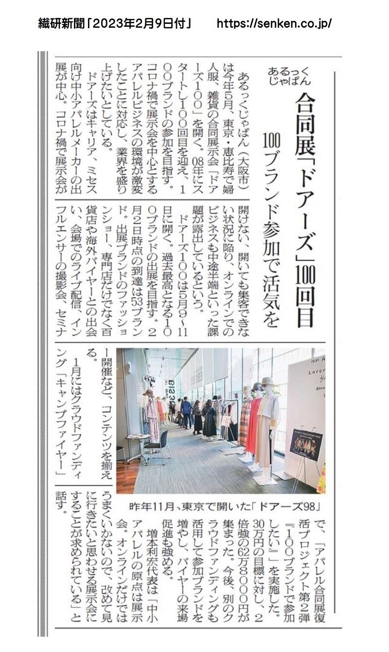 2月9日付け業界紙「繊研新聞」に取り上げて頂きました!「お陰様で、60ブランドまで手が上がりました!」今回の合同展Doors100回記念のメモリアル開催につきまして、弊社の思いと願いと意味を記事にして頂けました。本当に有難うございました。ご支援者の皆様はじめ、多くの方々の応援が後押しになっています。ぜひ100ブランドを集めて元気なアパレル業界をお目にかけたいと思っていますので、どうぞ更なるご協力を宜しくお願い致します。出展ブランドはまだまだ募集中です。ぜひご参加ください。■募集要項はこちらからダウンロード可能です。■繊研新聞さんはこちらから https://senken.co.jp/