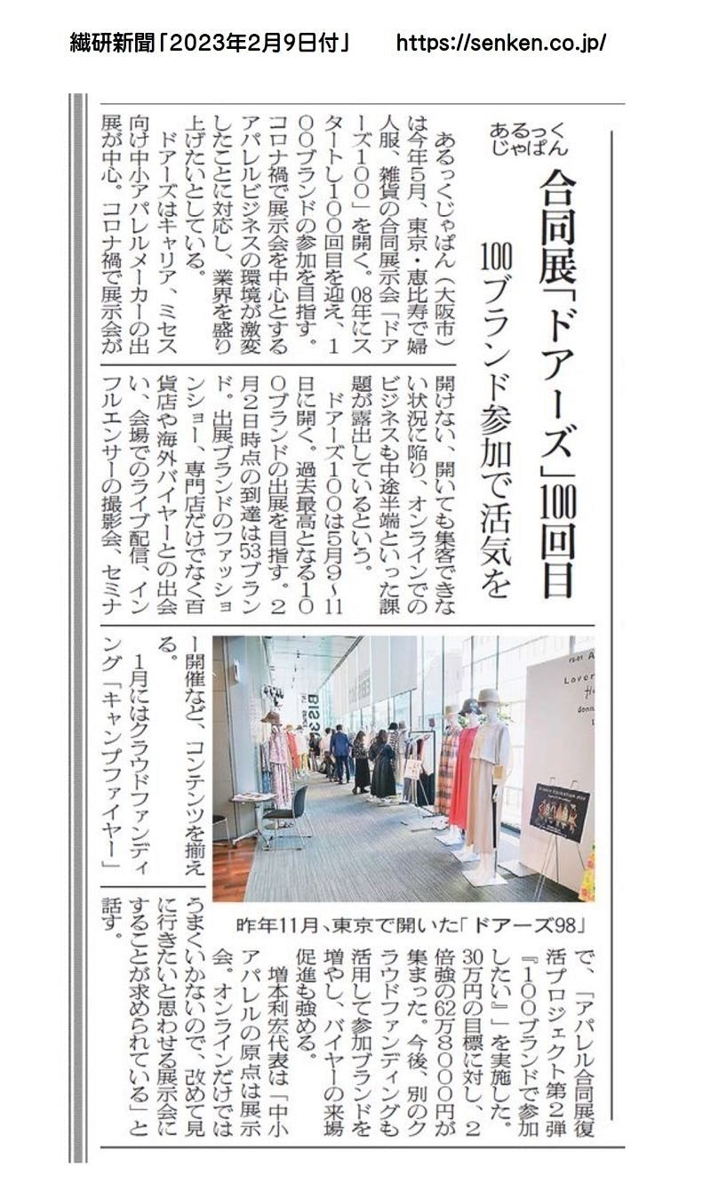 今回の合同展Doors100回記念のメモリアル開催につきまして、弊社の思いと願いと意味を記事にして頂けました。本当に有難うございました。ご支援者の皆様はじめ、多くの方々の応援が後押しになっています。ぜひ100ブランドを集めて元気なアパレル業界をお目にかけたいと思っていますので、どうぞ更なるご協力を宜しくお願い致します。出展ブランドはまだまだ募集中です。ぜひご参加ください。
