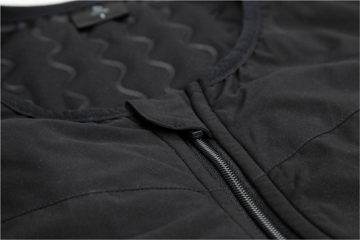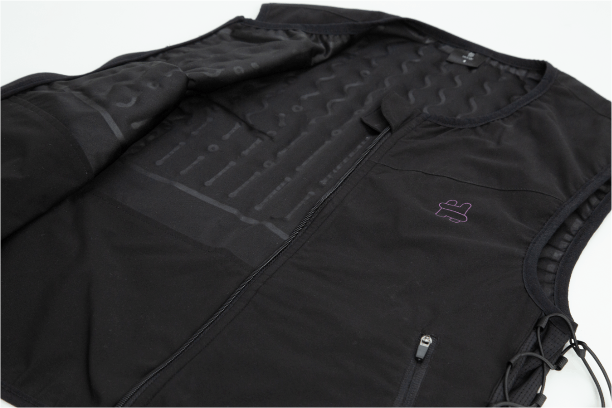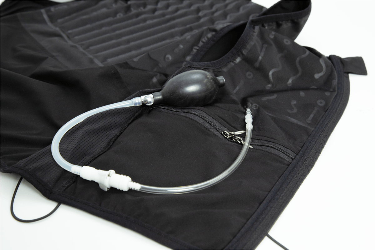HUGgy(ハギー)は、軽量化に成功した空気注入式の着圧ベストです。ベストの内側にあるエアーチューブにエアーを送り込むことでエアーチューブが拡張して、身体に対し垂直方向の圧力を加えます。