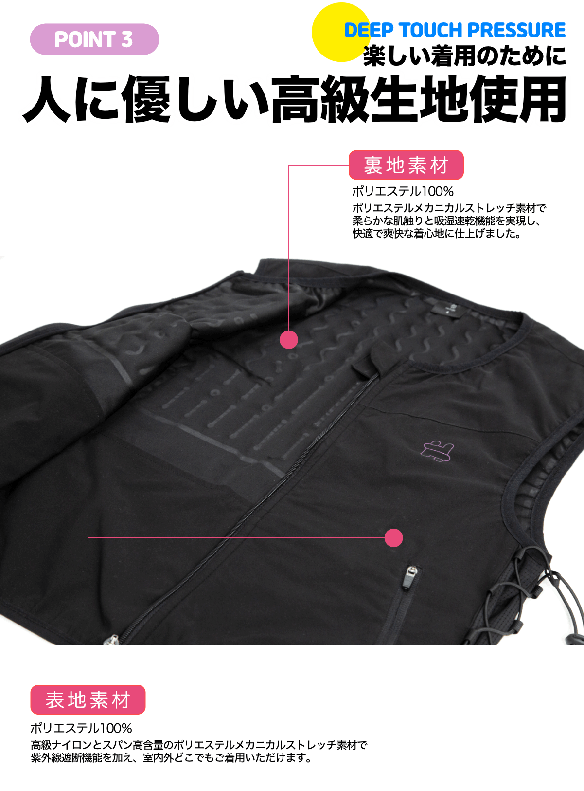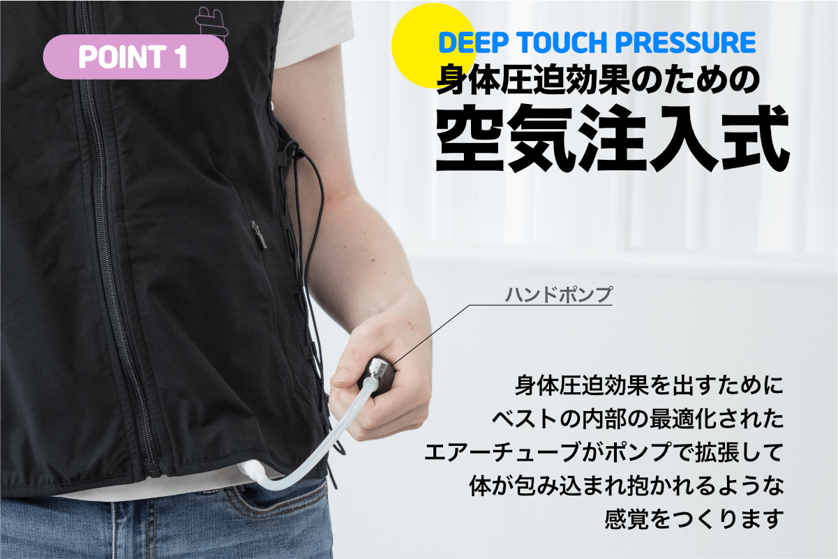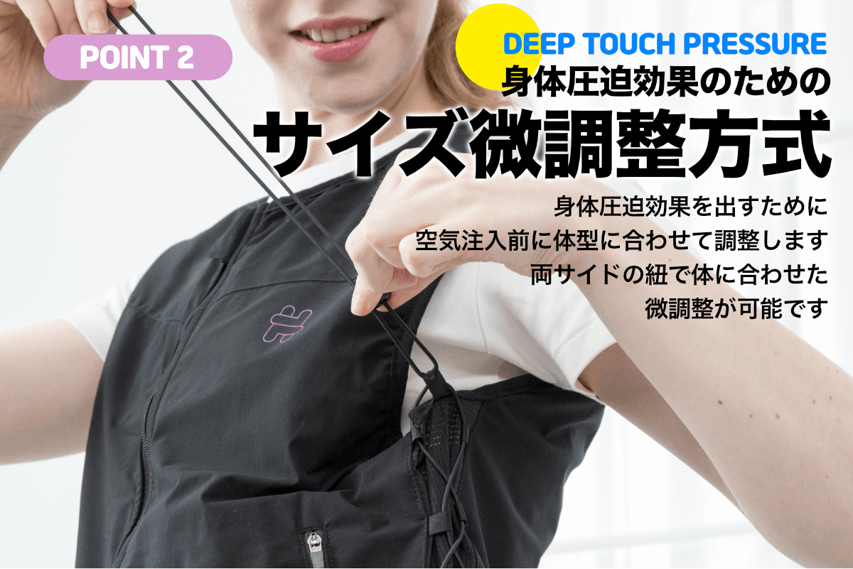 しかし、重さを加えて圧を生み出す加重着圧ベスト(ウエイトベスト)は、ベストの重さが子ども達の成長に支障をきたすとも言われています。