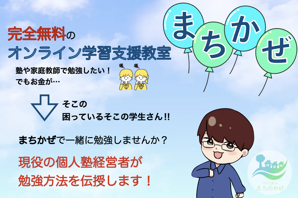 NPO法人まちのかぜでは、家庭環境や経済的な理由で、学校以外の塾や家庭教師などの学習支援を受けることができない学生に対して、完全無料のオンライン教室を開講しています。