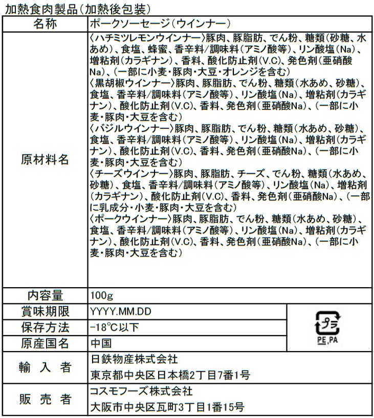 〈ハチミツレモンウインナー〉豚肉、豚脂肪、でん粉、糖類(砂糖、水あめ)、食塩、蜂蜜、香辛料/調味料(アミノ酸等)、リン酸塩(Na)、増粘剤(カラギナン)、香料、酸化防止剤(V.C)、発色剤(亜硝酸Na)、(一部に小麦・豚肉・大豆・オレンジを含む)
