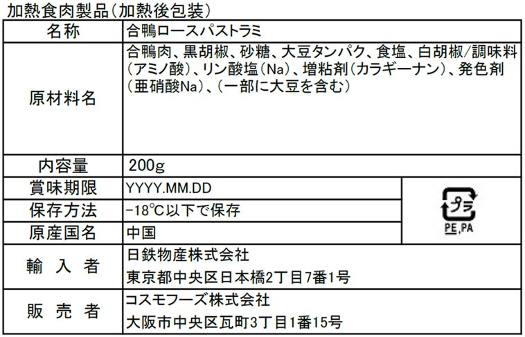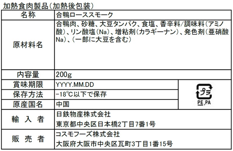 合鴨肉、砂糖、大豆タンパク、食塩、香辛料/調味料(アミノ酸等)、リン酸塩(Na)、増粘剤(カラギーナン)、発色剤(亜硝酸Na)、(一部に大豆を含む)