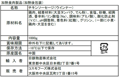 〈チーズウインナー〉豚肉、豚脂肪、チーズ、でん粉、糖類(水あめ、砂糖)、食塩、香辛料/調味料(アミノ酸等)、リン酸塩(Na)、増粘剤(カラギナン)、酸化防止剤(V.C)、香料、発色剤(亜硝酸Na)、(一部に乳成分・小麦・豚肉・大豆を含む)
