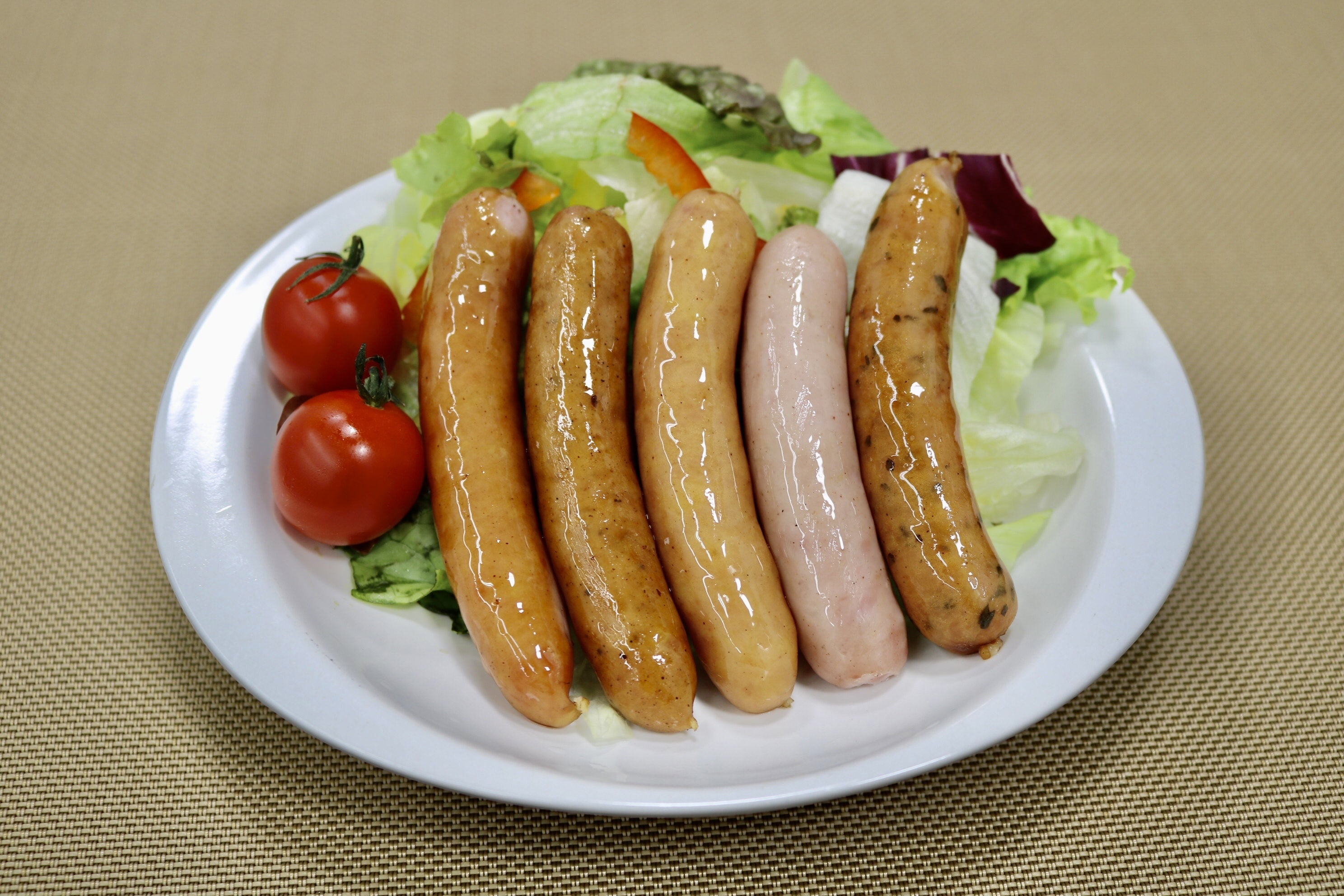 バラエティーウインナーは、『ハチミツレモン』、『黒胡椒』、『バジル』、『チーズ』、『プレーン』の5種類が1パックのアソートになっている商品です。一度に5種類の味を楽しむことができる、お得感満載の逸品になっております。朝食の一品やお弁当の一品、お酒のお供とあらゆる場面で活躍できます。