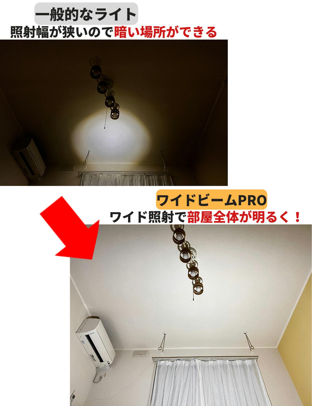 この通り、その違いは一目瞭然。ワイドビームPROの照射範囲がいかに広いかご理解いただけると思います。