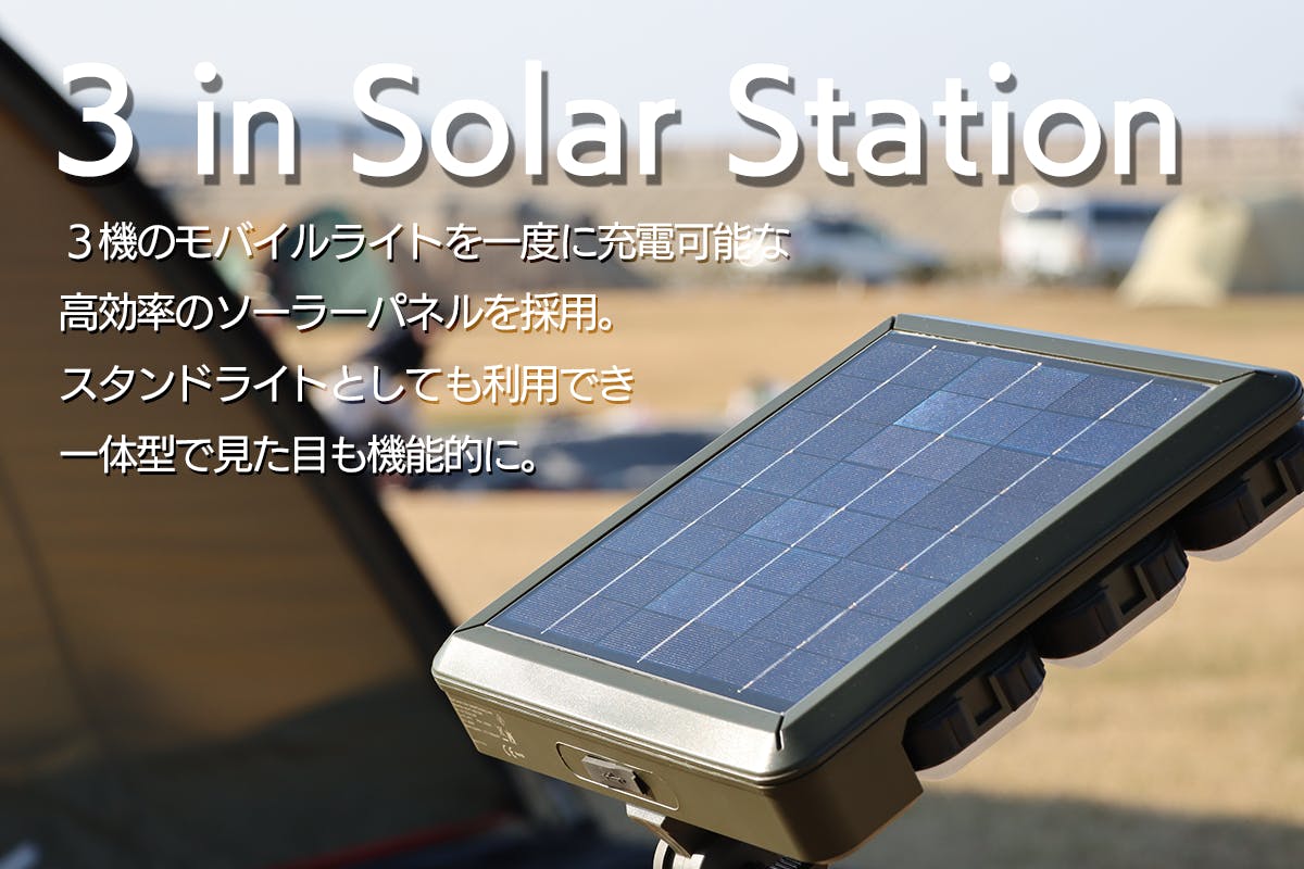 3台を一度に充電可能で災害時でなくとも太陽光の下に置いておくだけで充電が行われ緊急時に即対応できます。