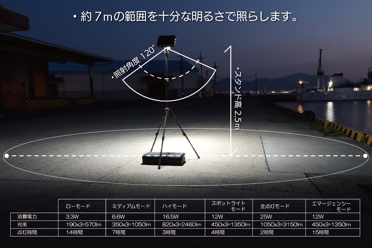 トライポッド使用で最大2mの高さから約7mの範囲を十分な明るさで照らすことができます。