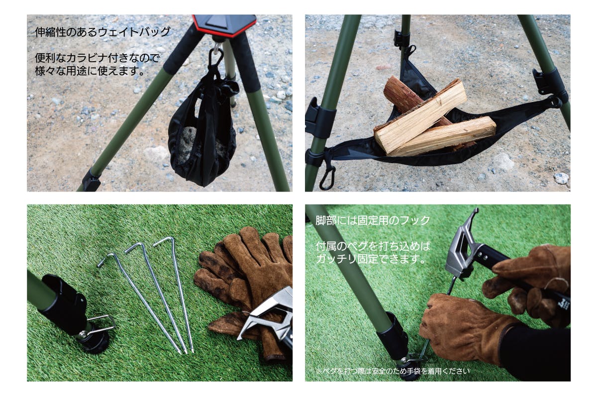 風下でも転倒防止に安心のウェイトバッグとトライポッド固定用ペグ付き!